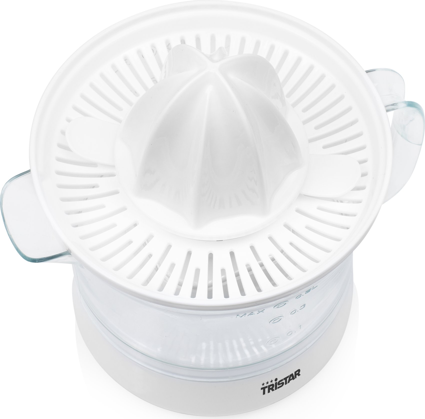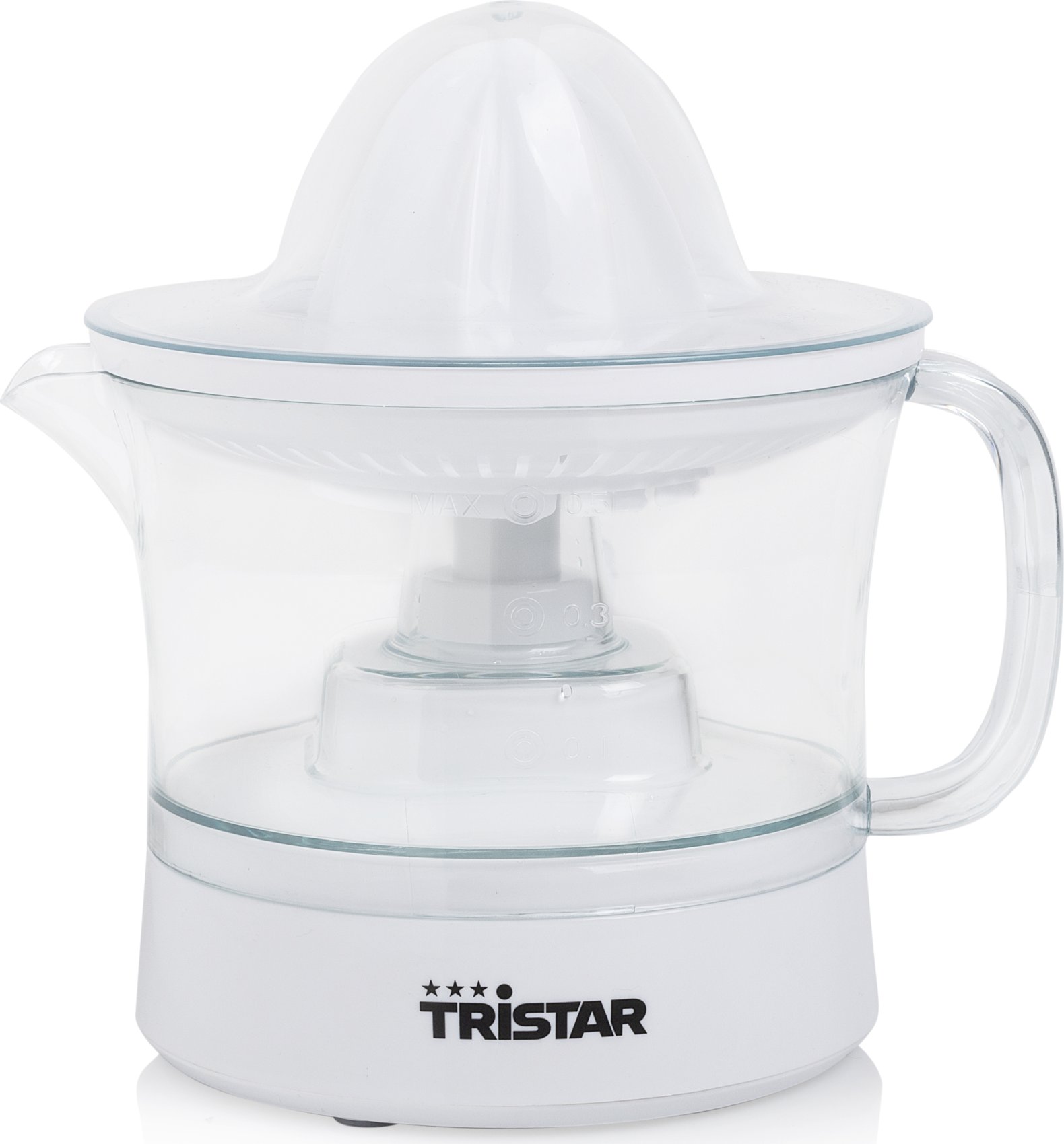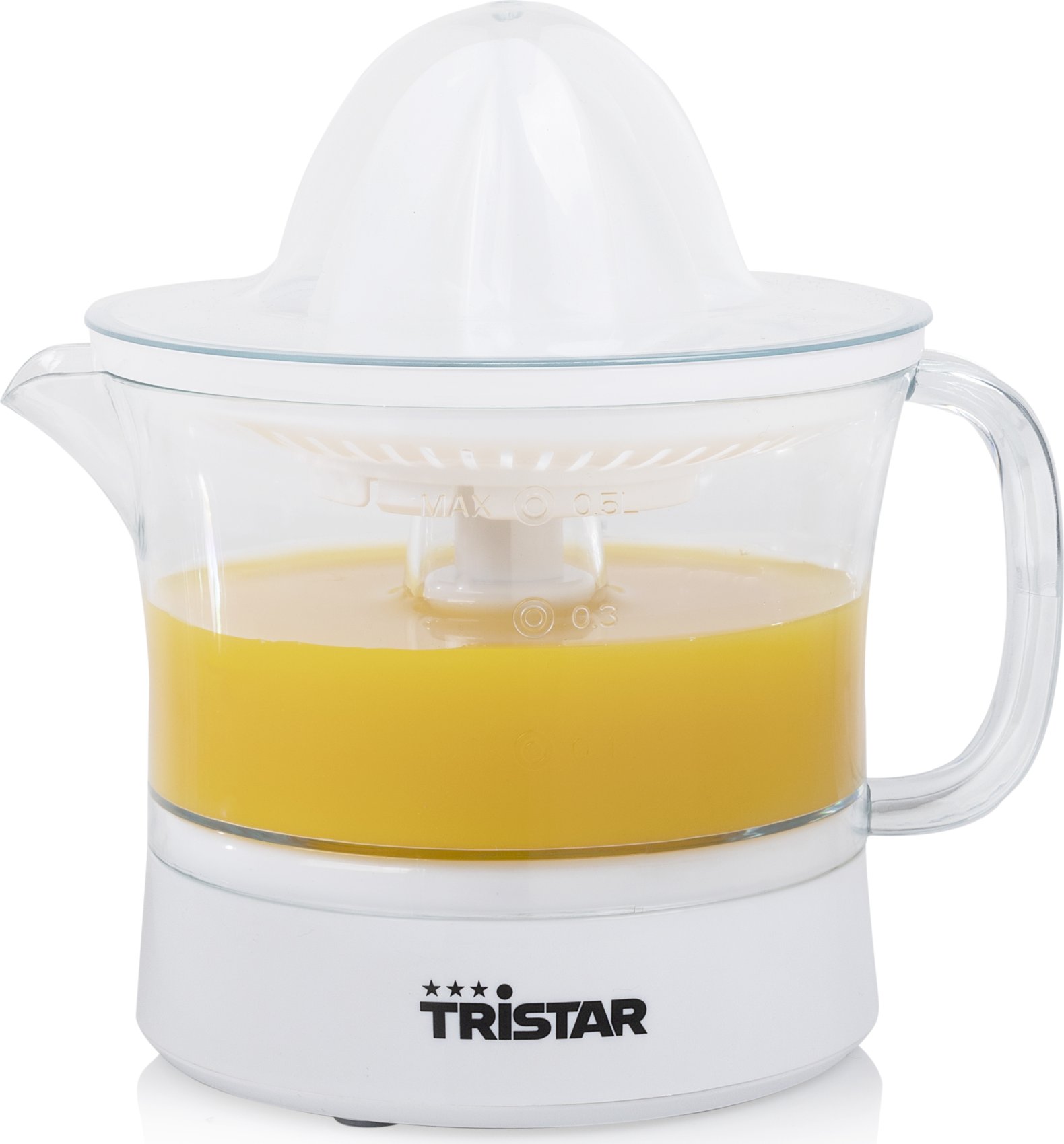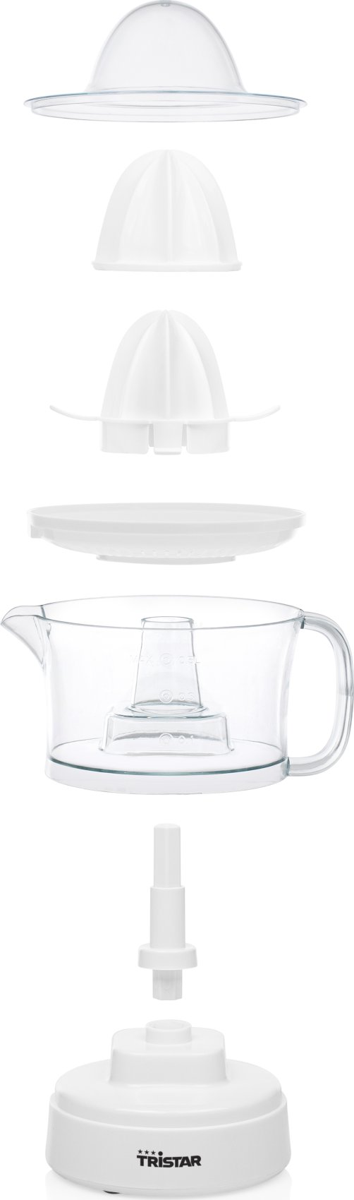 Exprimidor de fácil uso para preparar zumo casero. Su cono pequeño exprimirá pequeñas frutas como naranjas, limones y limas, mientras que el cono grande es perfecto para pomelos.Tristar CP-3005 Exprimidor. Color del producto: Blanco, Capacidad del tazón: 0,5 L, Longitud de cable: 1 m. Potencia: 25 W, Voltaje de entrada AC: 230 V, Frecuencia de entrada AC: 50 Hz. Cantidad por paquete: 1 pieza(s)