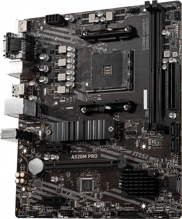MSI A520M PRO. Fabricante de procesador: AMD, Socket de procesador: Zócalo AM4, Procesador compatible: AMD Ryzen 3000 Series. tipos de memoria compatibles: DDR4-SDRAM, Memoria interna máxima: 64 GB, Tipo de ranuras de memoria: DIMM. Interfaces de disco de almacenamiento soportados: PCI Express 3.0, SATA, Tipos de unidades de almacenamiento admitidas: HDD & SSD, Niveles RAID: 0, 1, 10. Máxima resolución: 4096 x 2160 Pixeles. Tipo de interfaz ethernet: Gigabit Ethernet, Controlador LAN: Realtek 8111H