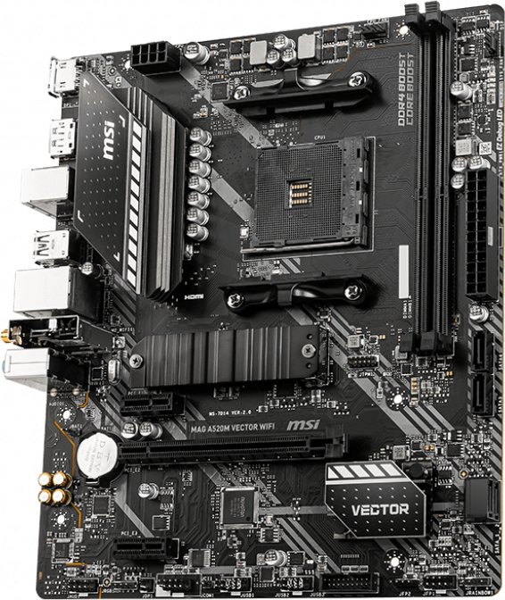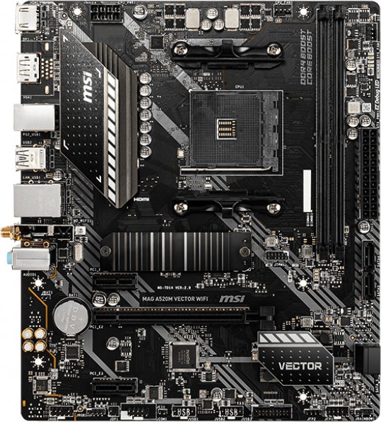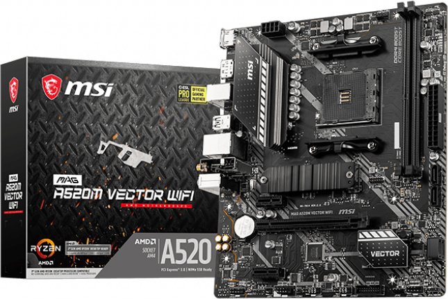 MSI MAG A520M VECTOR WIFI. Fabricante de procesador: AMD, Socket de procesador: Zócalo AM4, Procesador compatible: AMD Ryzen 3000 Series. tipos de memoria compatibles: DDR4-SDRAM, Memoria interna máxima: 64 GB, Tipo de ranuras de memoria: DIMM. Interfaces de disco de almacenamiento soportados: SATA III, Tipos de unidades de almacenamiento admitidas: HDD & SSD, Niveles RAID: 0, 1, 5, 10. Memoria máxima de adaptador de gráficos: 2048 MB, Máxima resolución: 4096 x 2160 Pixeles. Tipo de interfaz ethernet: Gigabit Ethernet, Controlador LAN: Realtek RTL8111H, Wi-Fi estándares: 802.11a, 802.11b, 802.11g, Wi-Fi 4 (802.11n), Wi-Fi 5 (802.11ac)
