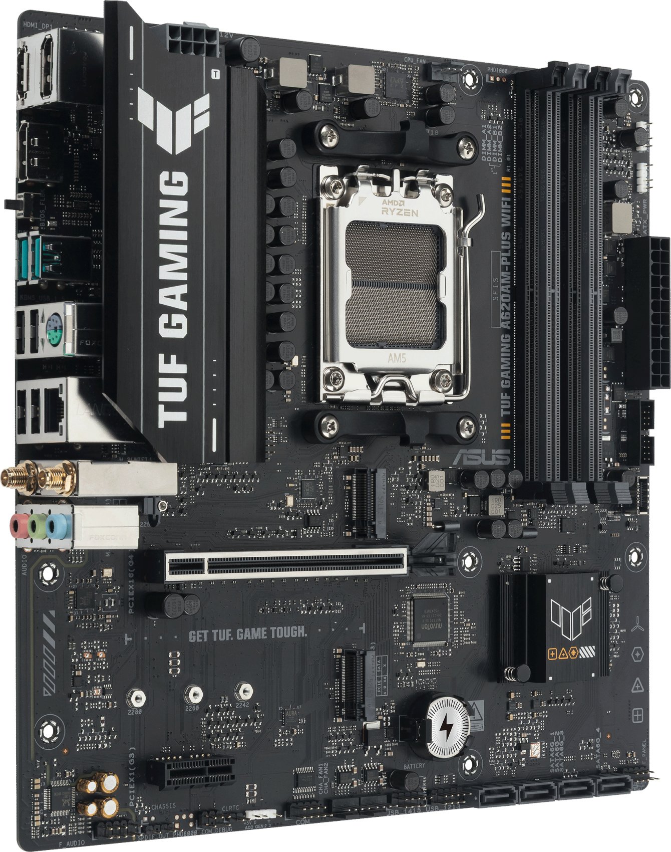 ASUS TUF GAMING A620AM-PLUS WIFI. Fabricante de procesador: AMD, Socket de procesador: Zócalo AM5, Procesador compatible: AMD Ryzen 7000 Series, AMD Ryzen 8000 Series, AMD Ryzen 9000 Series. tipos de memoria compatibles: DDR5-SDRAM, Memoria interna máxima: 256 GB, Tipo de ranuras de memoria: DIMM. Interfaces de disco de almacenamiento soportados: M.2, SATA III, Tipos de unidades de almacenamiento admitidas: HDD & SSD, Niveles RAID: 0, 1, 5, 10. Tipo de interfaz ethernet: 2.5 Gigabit Ethernet, Estándar Wi-Fi: Wi-Fi 6 (802.11ax), Wi-Fi estándares: Wi-Fi 6 (802.11ax). Componente para: PC, Factor de forma: micro ATX, Familia del chipset: AMD