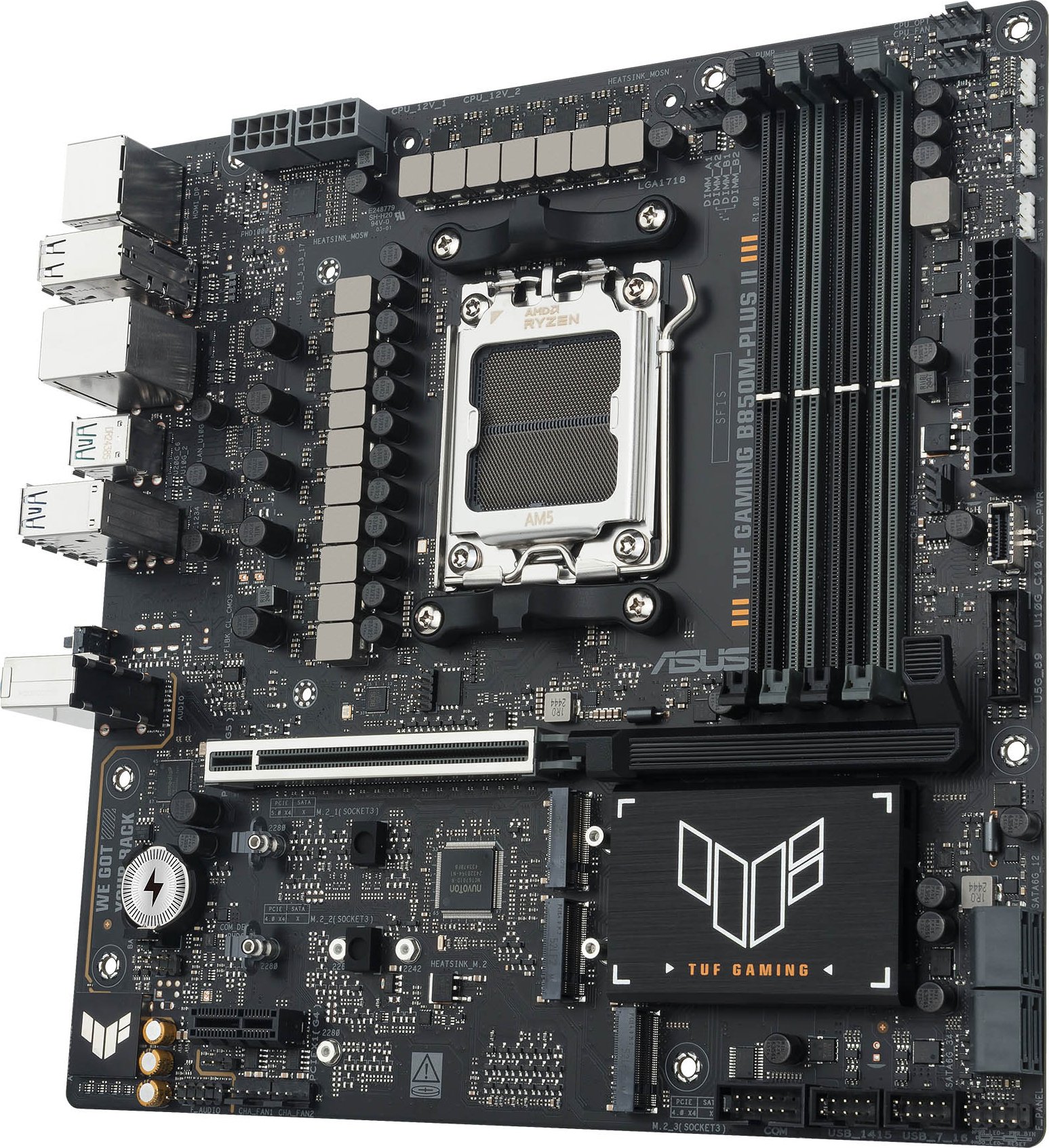 ASUS TUF GAMING B850M-PLUS II. Fabricante de procesador: AMD, Socket de procesador: Zócalo AM5, Procesador compatible: AMD Ryzen 7000 Series, AMD Ryzen 8000 Series, AMD Ryzen 9000 Series. tipos de memoria compatibles: DDR5-SDRAM, Memoria interna máxima: 256 GB, Tipo de ranuras de memoria: DIMM. Interfaces de disco de almacenamiento soportados: M.2, SATA III, Tipos de unidades de almacenamiento admitidas: HDD & SSD, Niveles RAID: 0, 1, 5, 10. Tipo de interfaz ethernet: 2.5 Gigabit Ethernet. Componente para: PC, Factor de forma: micro ATX, Familia del chipset: AMD
