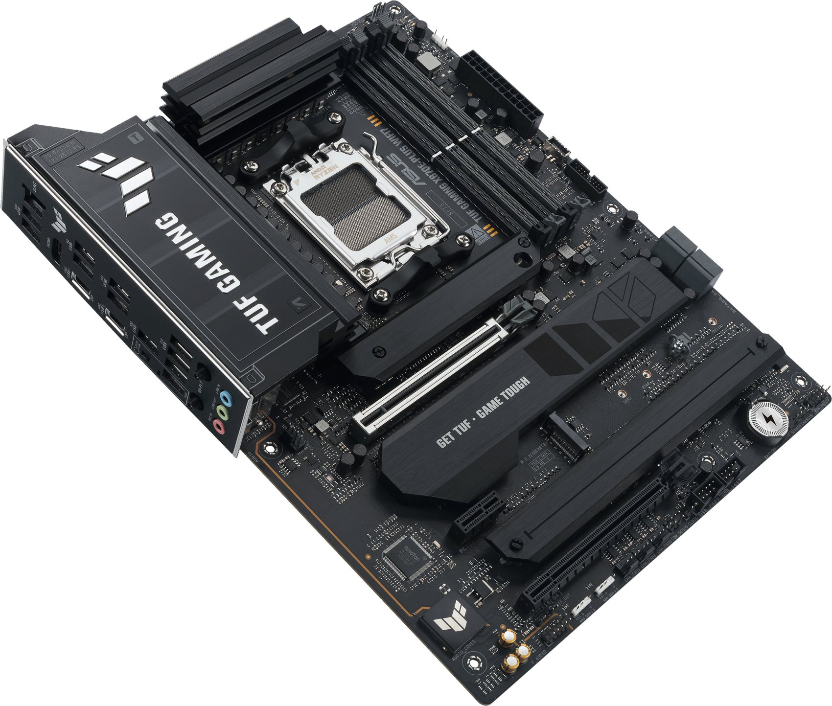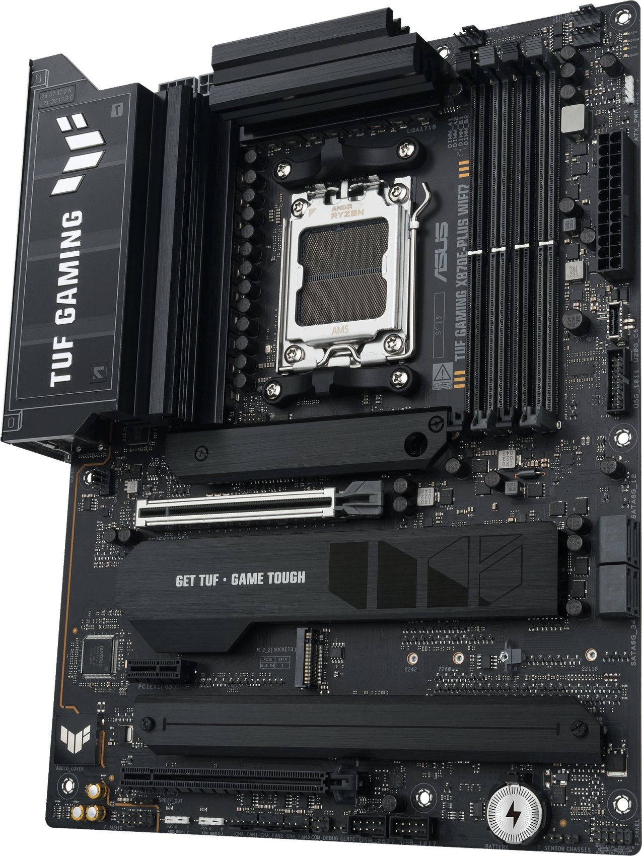 ASUS TUF GAMING X870E-PLUS WIFI7. Fabricante de procesador: AMD, Socket de procesador: Zócalo AM5, Procesador compatible: AMD Ryzen 7000 Series, AMD Ryzen 8000 Series, AMD Ryzen 9000 Series. tipos de memoria compatibles: DDR5-SDRAM, Memoria interna máxima: 256 GB, Tipo de ranuras de memoria: DIMM. Interfaces de disco de almacenamiento soportados: M.2, PCI Express 4.0, PCI Express 5.0, SATA III, Tipos de unidades de almacenamiento admitidas: HDD & SSD, Niveles RAID: 0, 1, 5, 10. Tipo de interfaz ethernet: 2.5 Gigabit Ethernet, Estándar Wi-Fi: Wi-Fi 7 (802.11be), Wi-Fi estándares: Wi-Fi 7 (802.11be). Componente para: PC, Factor de forma: ATX, Familia del chipset: AMD