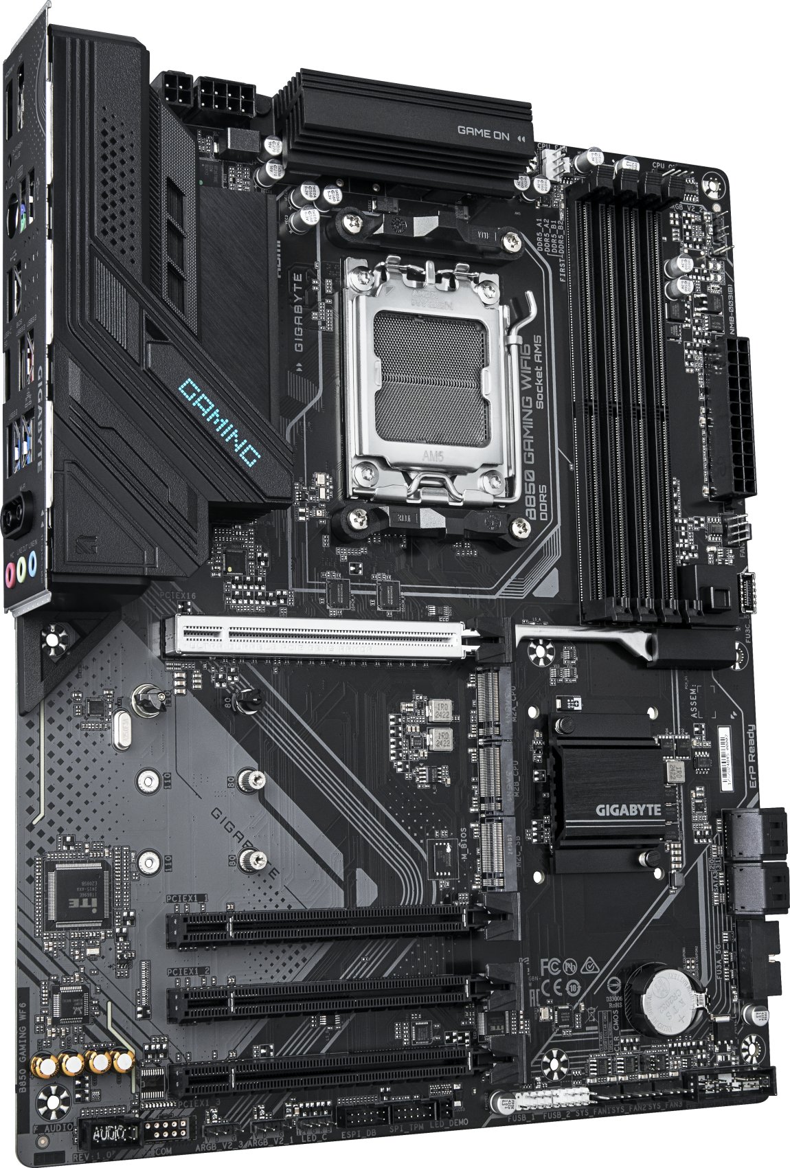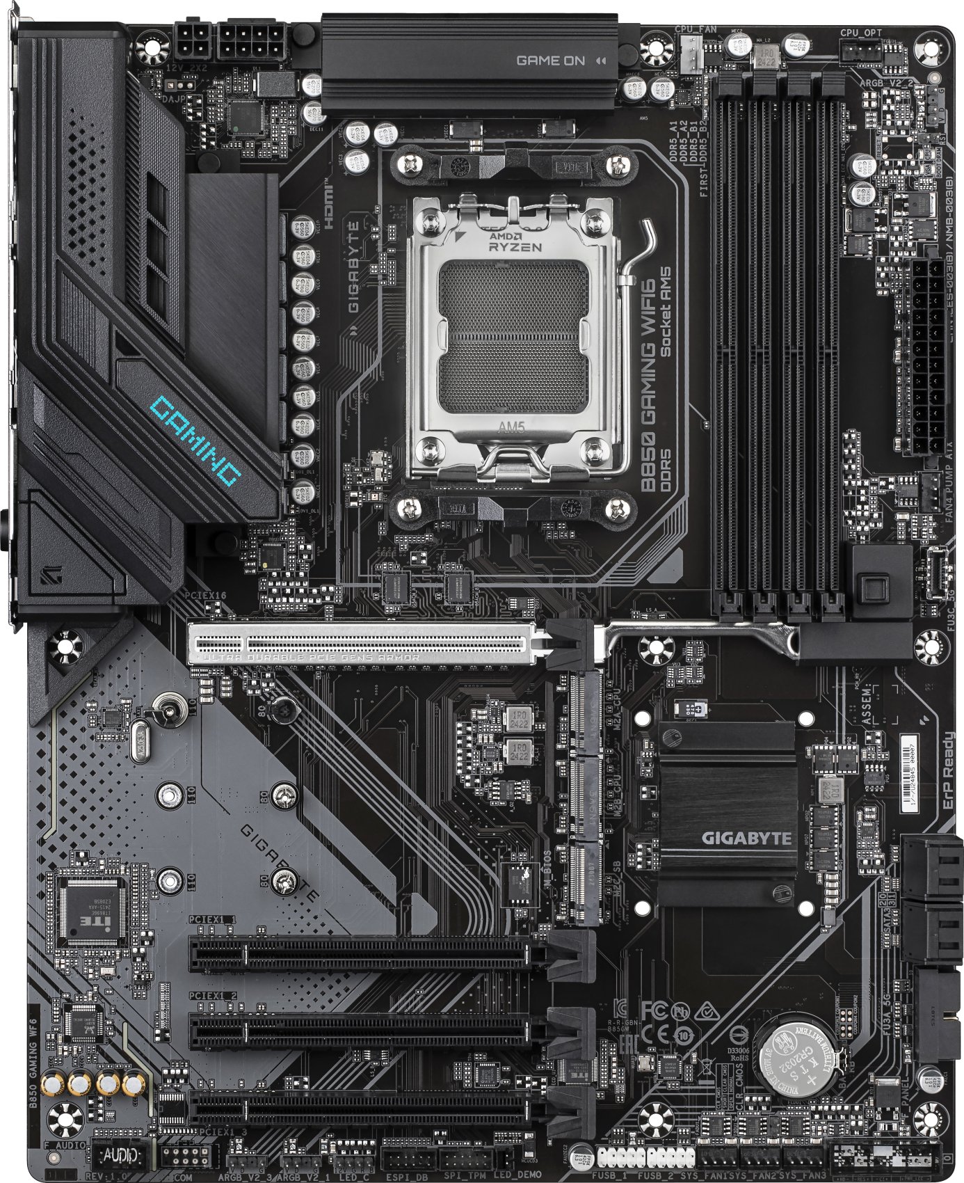 GIGABYTE B850 GAMING WIFI6 Placa Base - Procesadores AMD Ryzen Serie 9000, VRM digital de 6+2+2 fases, hasta 8200MHz DDR5 (OC), 1xPCIe 5.0 + 2xPCIe 4.0 M.2, LAN GbE, WIFI 6, USB 3.2 Gen 2. Fabricante de procesador: AMD, Socket de procesador: Zócalo AM5, Procesador compatible: AMD Ryzen 7000 Series, AMD Ryzen 8000 Series, AMD Ryzen 9000 Series. tipos de memoria compatibles: DDR5-SDRAM, Memoria interna máxima: 256 GB, Tipo de ranuras de memoria: DIMM. Interfaces de disco de almacenamiento soportados: M.2, SATA III, Tipos de unidades de almacenamiento admitidas: HDD & SSD, Niveles RAID: 0, 1, 10. Máxima resolución: 4096 x 2160 Pixeles. Tipo de interfaz ethernet: Gigabit Ethernet, Estándar Wi-Fi: Wi-Fi 6 (802.11ax), Wi-Fi estándares: 802.11a, 802.11b, 802.11g, Wi-Fi 4 (802.11n), Wi-Fi 5 (802.11ac), Wi-Fi 6 (802.11ax)