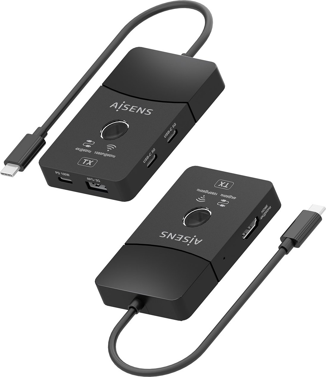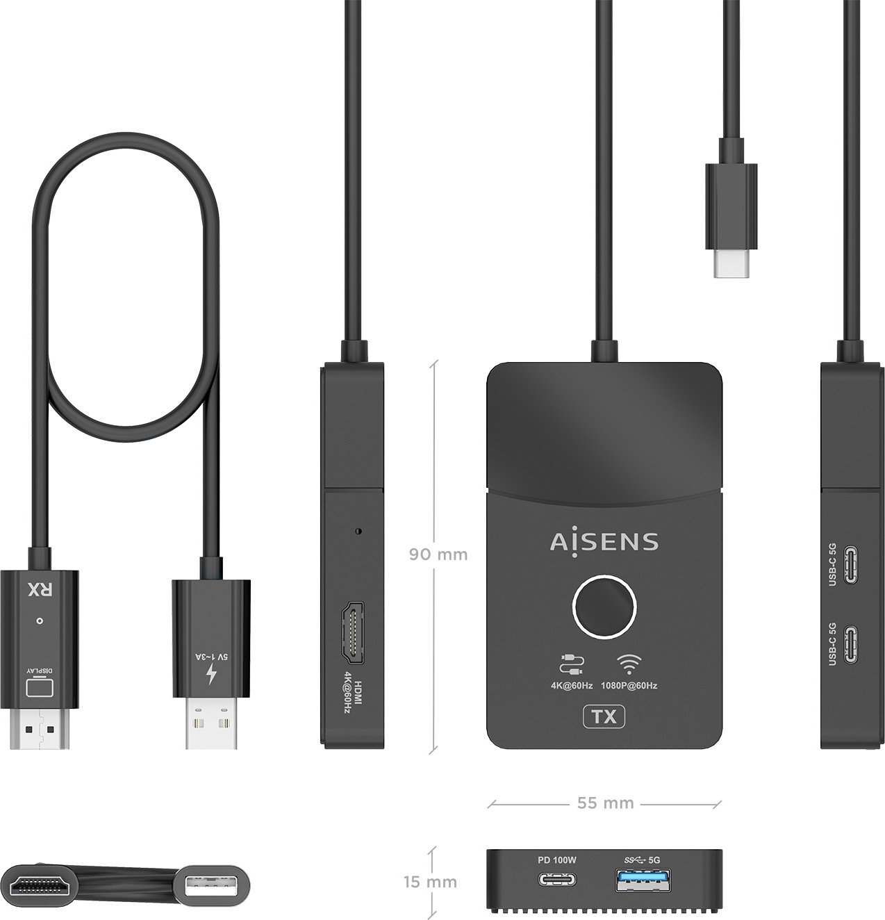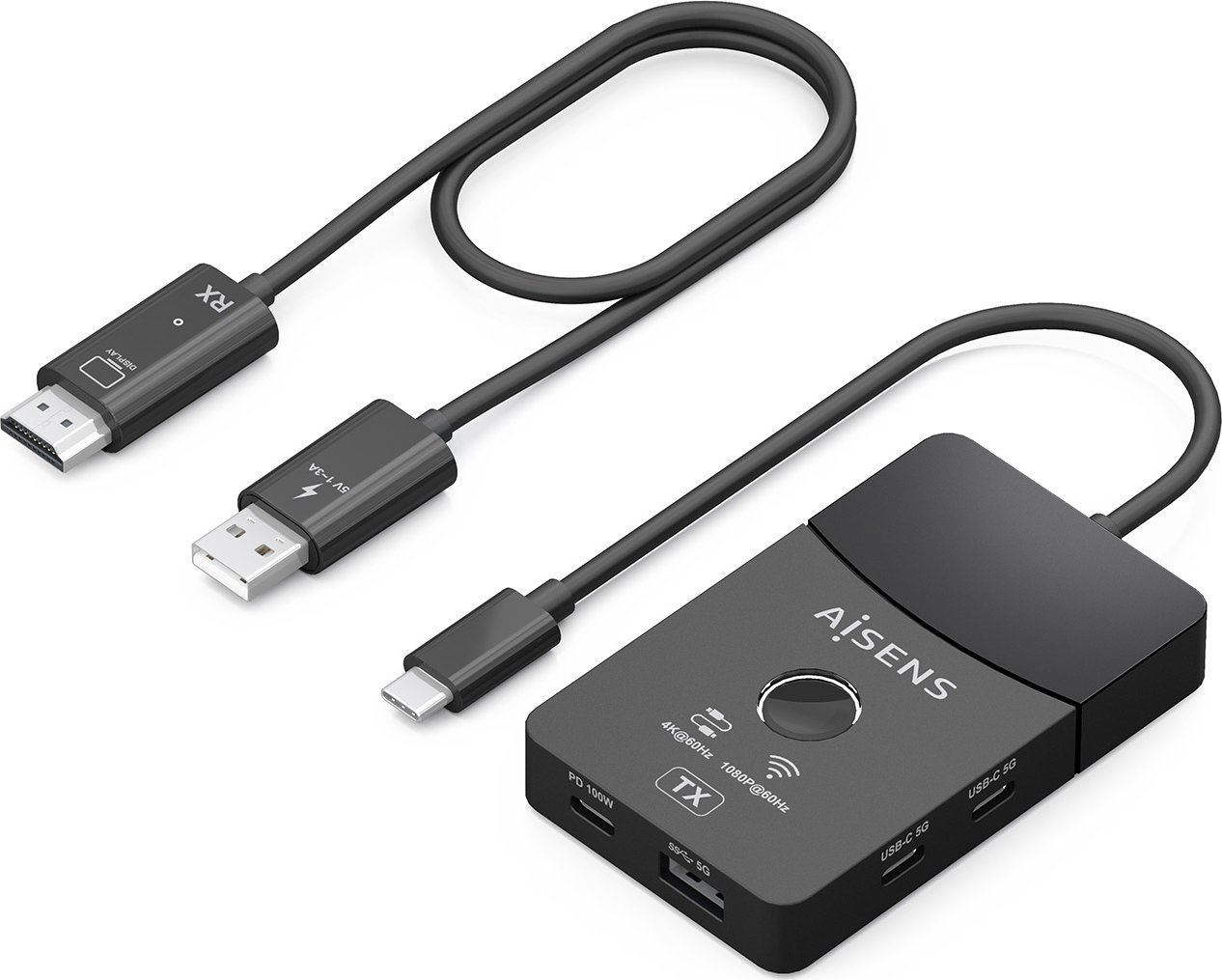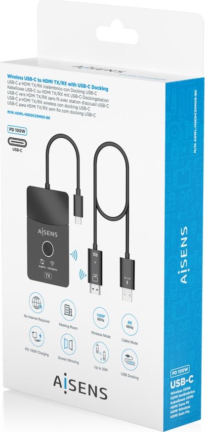 Aisens Docking Usb-c A Hdmi 1080p@60hz (inalámbrico) 30m, 1xhdmi 4k60hz (Cable) 2xUSB-C 1xUSB-A 1xUSB-C PD 100W, Negro