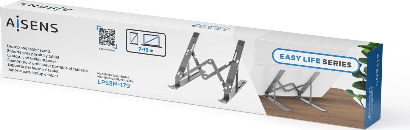 AISENS Soporte de Sobremesa Ajustable para Portatil / Tablet, Gris. Tipo de producto: Soporte para ordenador portátil y tableta, Color del producto: Gris, Material: Aluminio. Longitud: 255 mm. Ancho del paquete: 270 mm, Profundidad del paquete: 50 mm, Altura del paquete: 26 mm. Contenido del paquete: 1 x Soporte de sobremesa plegable y ajustable para portátil o Tablet 1 x Funda para soporte. Ancho de la caja principal: 270 mm, Longitud de la caja: 275 mm, Alto de la caja principal: 280 mm