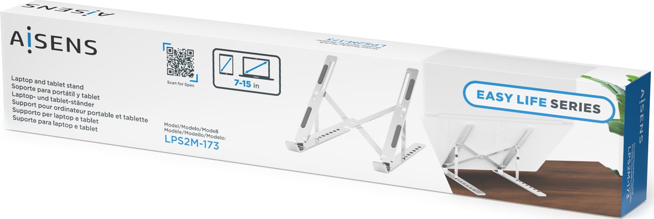AISENS Soporte de Sobremesa Ajustable para Portatil / Tablet, Plata. Tipo de producto: Soporte para ordenador portátil y tableta, Color del producto: Plata, Material: Aluminio. Longitud: 251 mm. Ancho del paquete: 270 mm, Profundidad del paquete: 50 mm, Altura del paquete: 26 mm. Contenido del paquete: 1 x Soporte de sobremesa plegable y ajustable para portátil o Tablet 1 x Funda para soporte. Ancho de la caja principal: 270 mm, Longitud de la caja: 275 mm, Alto de la caja principal: 280 mm