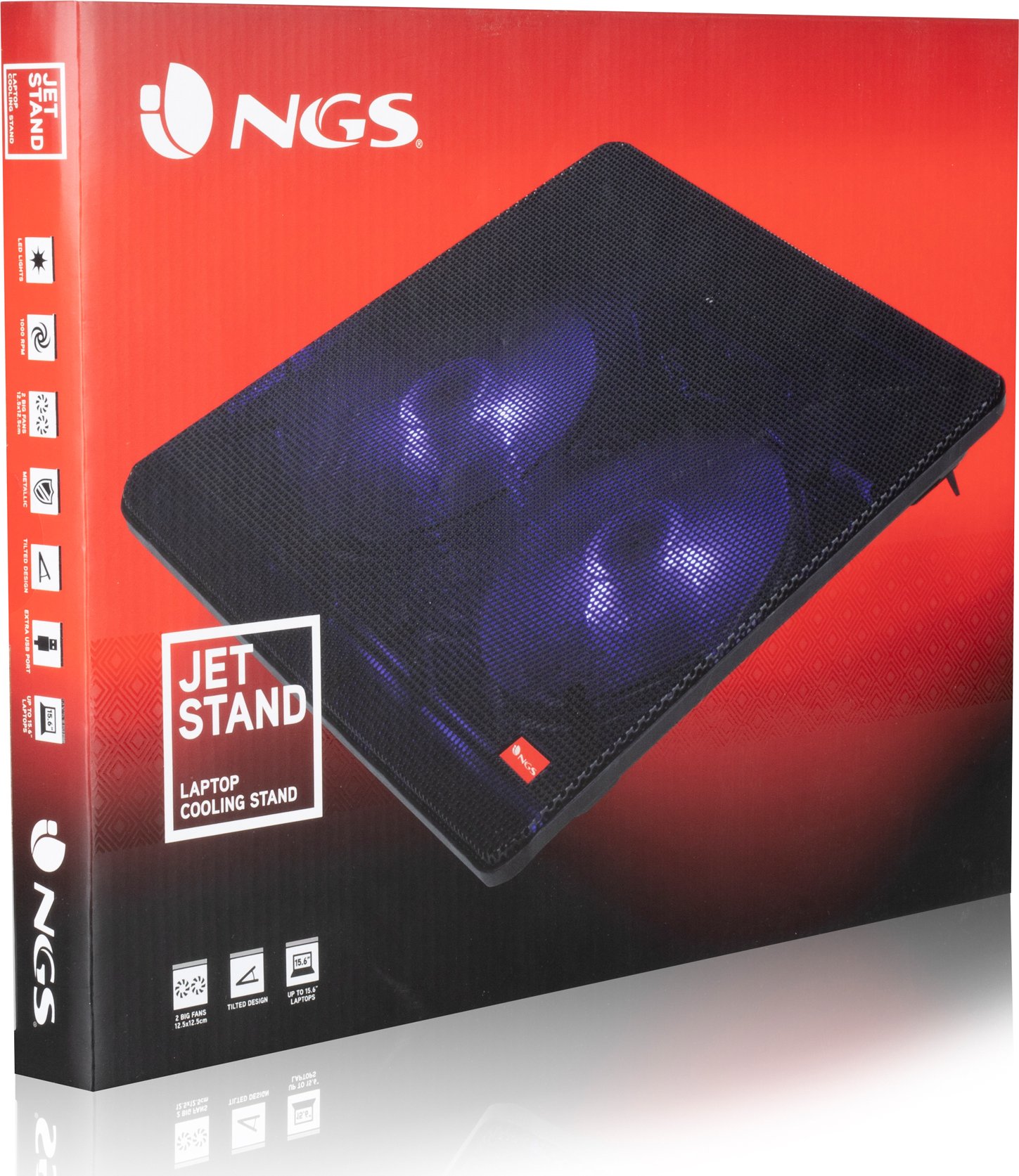 NGS Jetstand. Tamaño máximo de pantalla: 39,6 cm (15.6"), Número de ventiladores incluidos: 2 pieza(s), Diámetro de ventilador: 12,5 cm. Color del producto: Negro, Material: Malla, Iluminación de color: Púrpura. Interfaz de host: USB. Alimentación: USB. Ancho: 325 mm, Profundidad: 250 mm, Altura: 25 mm