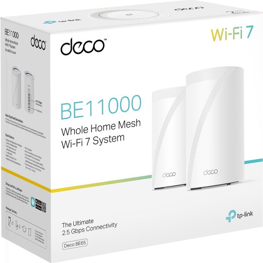 TP-Link Deco BE65. Color del producto: Blanco, Tipo de antena: Interno, Tipo de producto: Sistema de malla. Banda Wi-Fi: Tribanda (2.4 GHz / 5 GHz / 6 GHz), Estándar Wi-Fi: Wi-Fi 7 (802.11be), Tasa de transferencia de datos WLAN (máx.): 11000 Mbit/s. Asistente virtual: Amazon Alexa & Google Assistant, Compatible con servicios en la nube: TP-Link ID, Prestaciones de control parental: Hora de dormir, Perfiles personalizados, Family online time ranking, Tiempo en familia, Off time,.... Certificación: CE, FCC, RoHS. Ancho: 107,5 mm, Profundidad: 107,5 mm, Altura: 176 mm