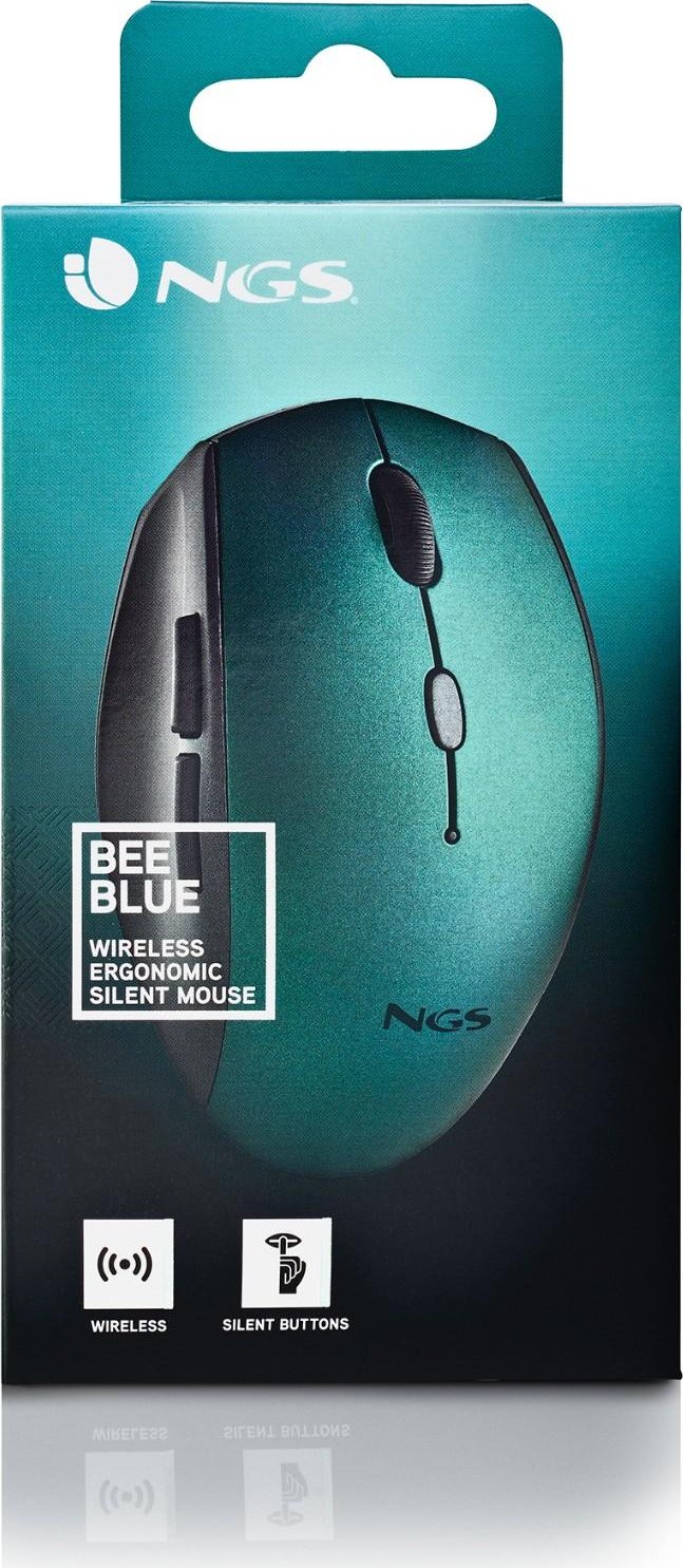 NGS BEE. Factor de forma: mano derecha, Diseño vertical. Tecnología de detección de movimientos: Óptico, Interfaz del dispositivo: RF inalámbrico, Resolución de movimiento: 1600 DPI, Tipo de botones: Botones presionados, Cantidad de botones: 5, Tipo de desplazamiento: Rueda. Fuente de energía: Baterías. Trabaja en cualquier superficie. Color del producto: Azul
