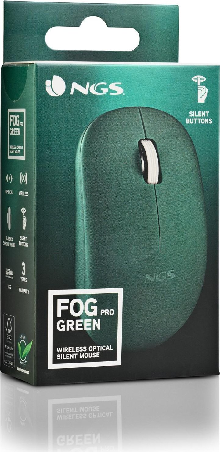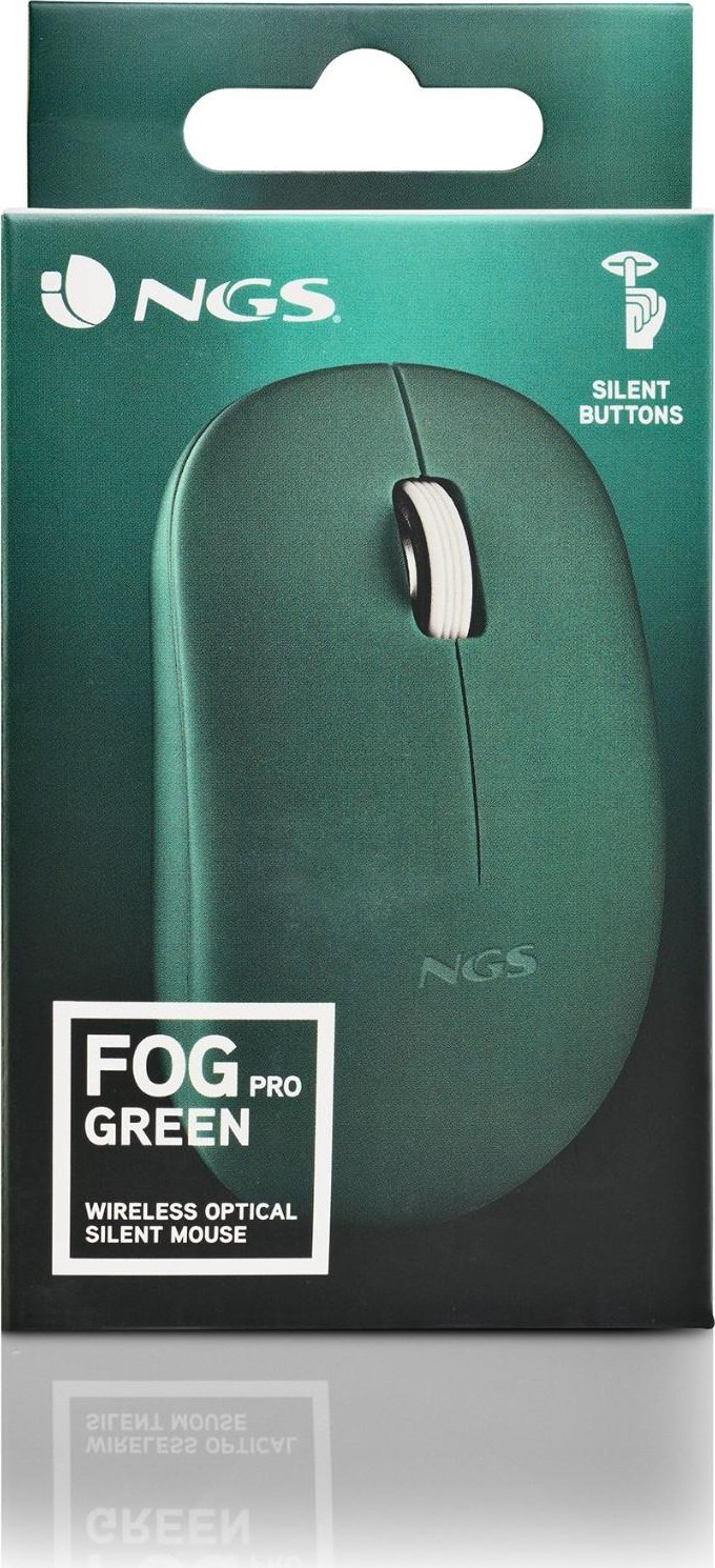 NGS FOG PRO. Factor de forma: Ambidextro. Tecnología de detección de movimientos: Óptico, Interfaz del dispositivo: RF inalámbrico, Resolución de movimiento: 1000 DPI, Tipo de botones: Botones presionados, Cantidad de botones: 2, Tipo de desplazamiento: Rueda. Fuente de energía: Baterías. Trabaja en cualquier superficie. Color del producto: Verde