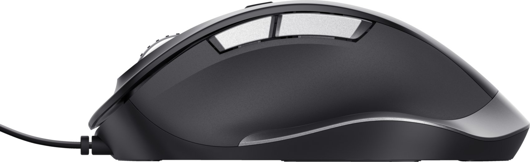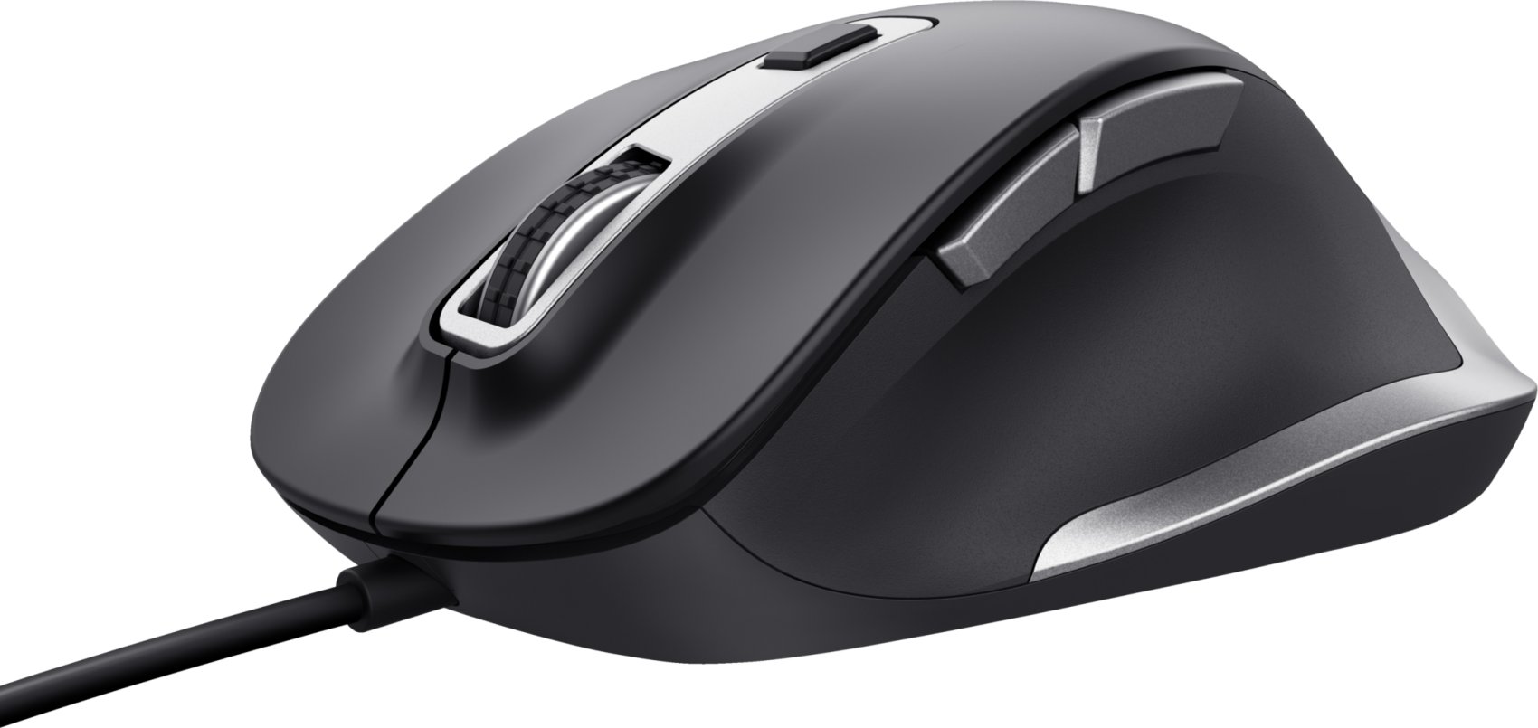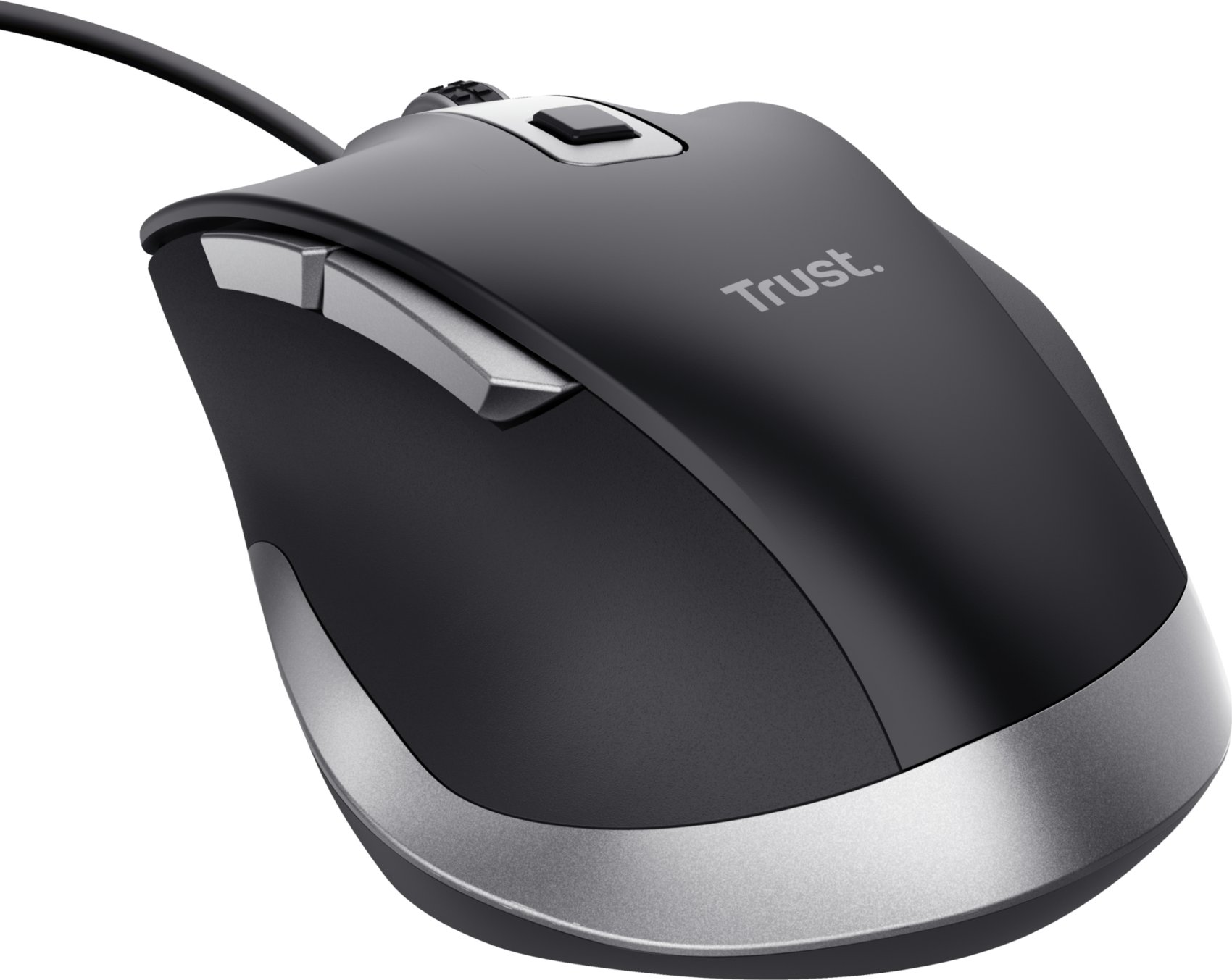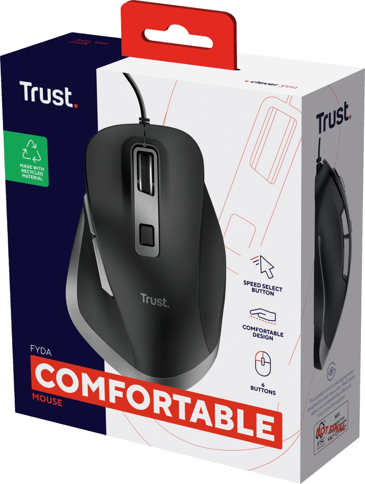 Trust Fyda. Factor de forma: mano derecha. Tecnología de detección de movimientos: Óptico, Interfaz del dispositivo: USB tipo A, Resolución de movimiento: 5000 DPI, Tipo de botones: Botones presionados, Cantidad de botones: 6, Tipo de desplazamiento: Rueda. Fuente de energía: Cable. Color del producto: Negro
