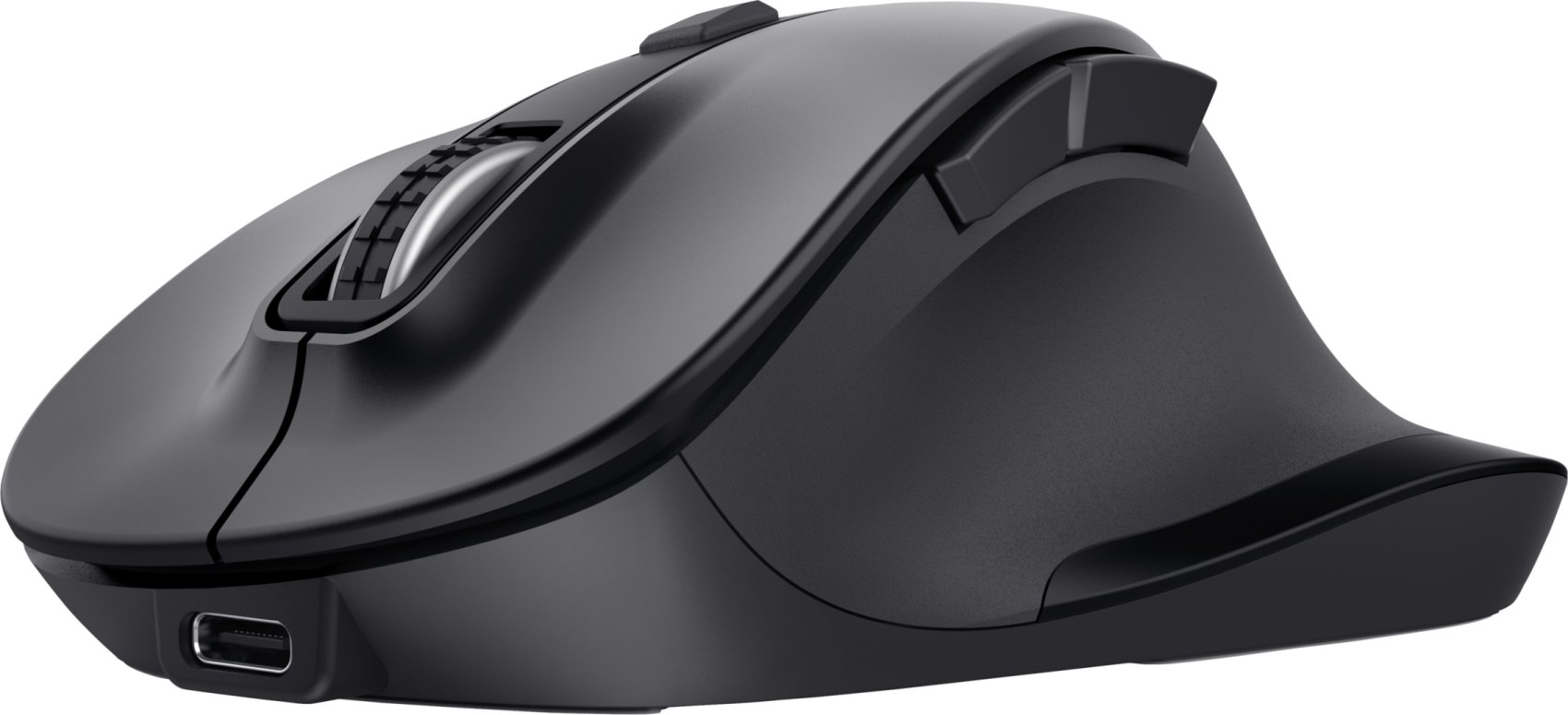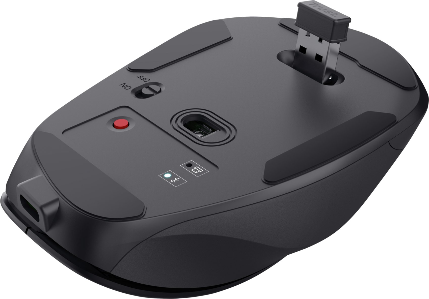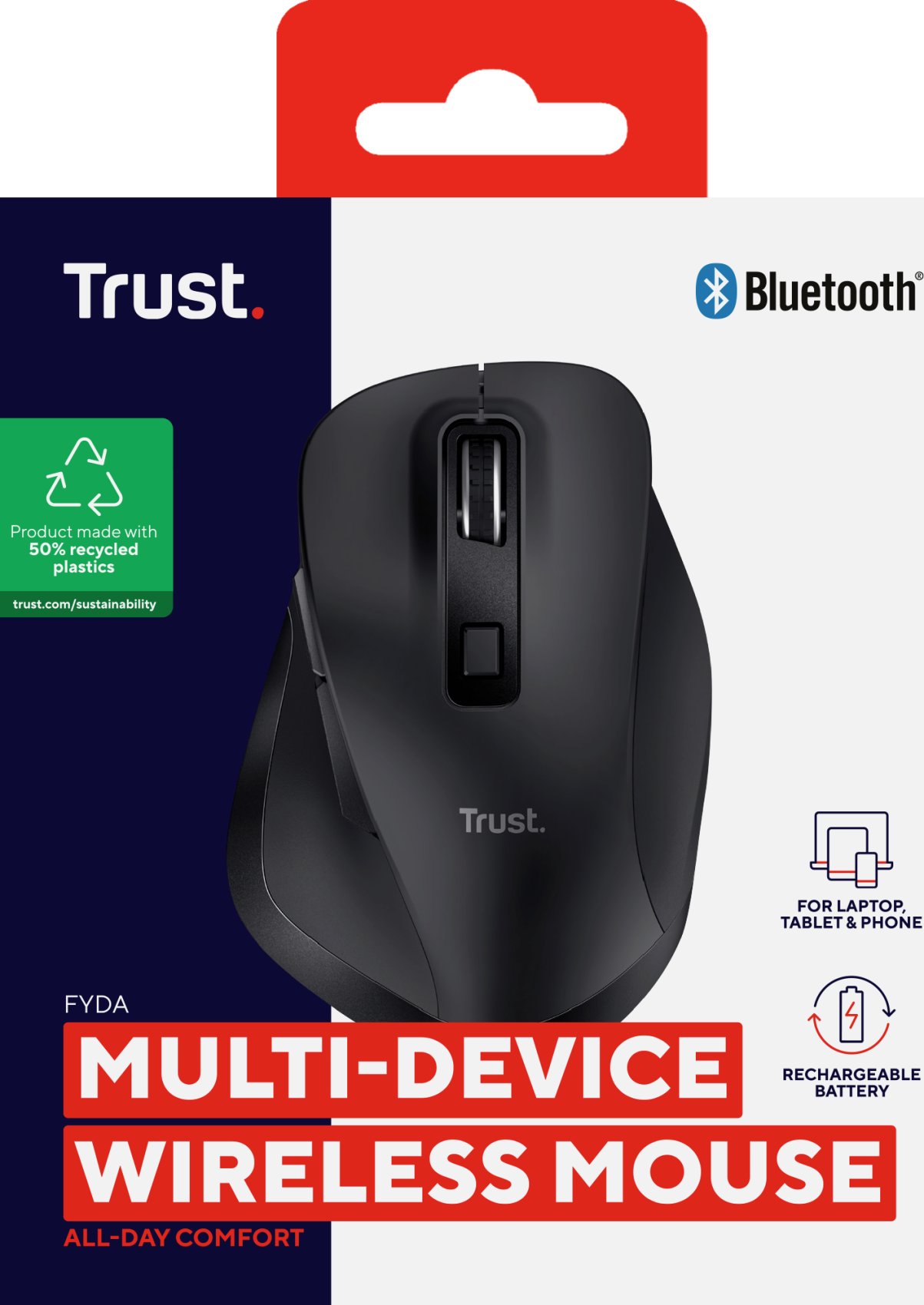 Trust Fyda. Factor de forma: mano derecha. Tecnología de detección de movimientos: Óptico, Interfaz del dispositivo: RF Wireless + Bluetooth, Resolución de movimiento: 2400 DPI, Tipo de botones: Botones presionados, Cantidad de botones: 6, Tipo de desplazamiento: Rueda. Fuente de energía: Baterías. Color del producto: Negro