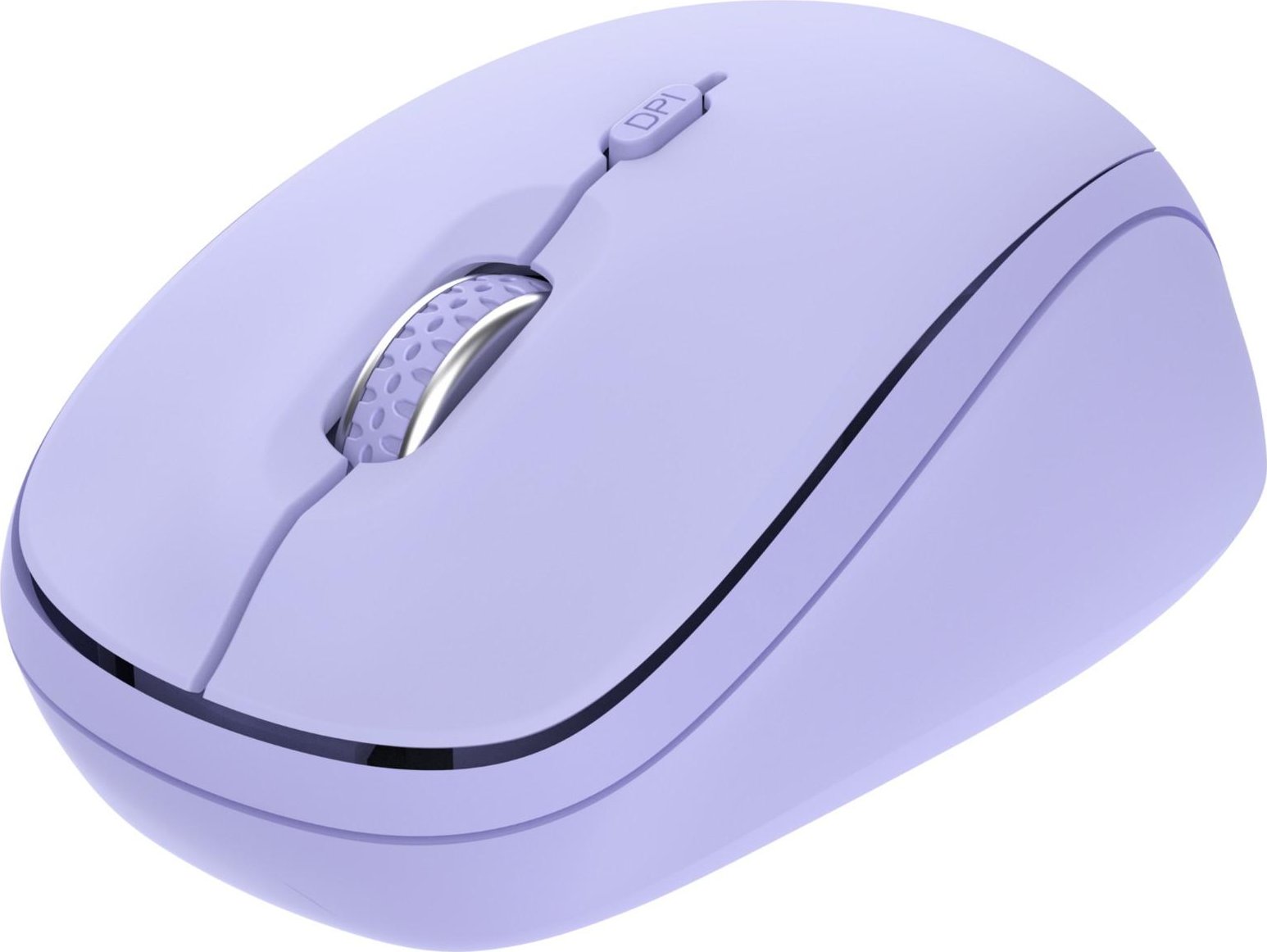 Trust Yvi+. Factor de forma: Ambidextro. Tecnología de detección de movimientos: Óptico, Interfaz del dispositivo: RF Wireless + Bluetooth, Resolución de movimiento: 1600 DPI, Tipo de botones: Botones presionados, Cantidad de botones: 3, Tipo de desplazamiento: Rueda. Fuente de energía: Baterías. Color del producto: Violeta