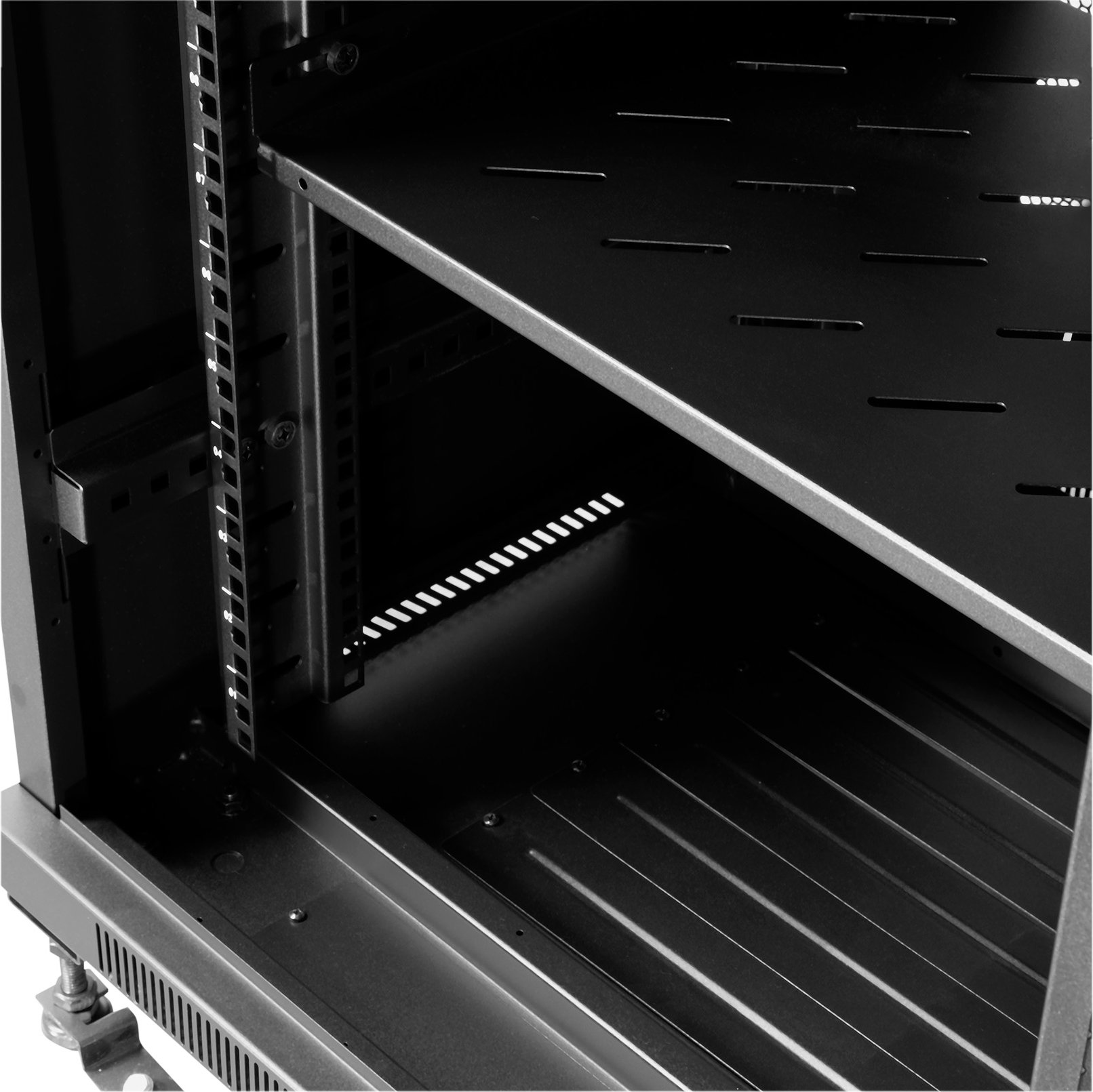 Distintas alturas y capacidades que van desde 22U a 47U, con anchos de entre 600 mm a 800 mm y fondos entre 600 mm a 1000 mm. Todos los armarios poseen puertas de cristal, perforadas o, en el caso de los armarios más grandes, existe la opción de doble puerta, lo que permite trabajar en una parte del mueble mientras la otra parte está cerrada y protegida.- Armario rack de suelo con ancho estándar de 19” (482,6 mm) y estructura desmontable.