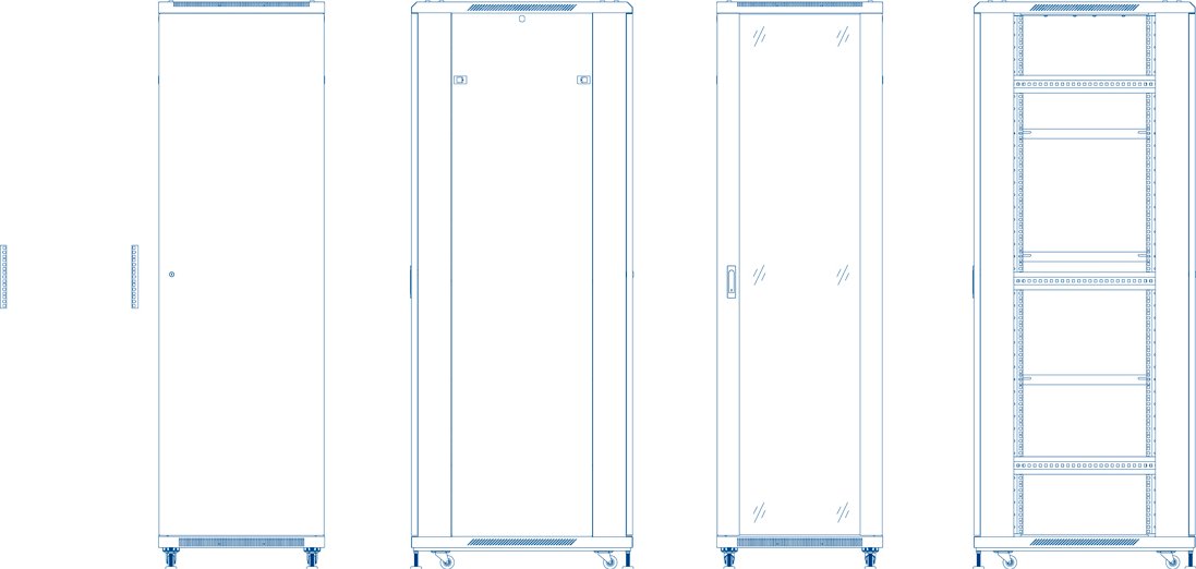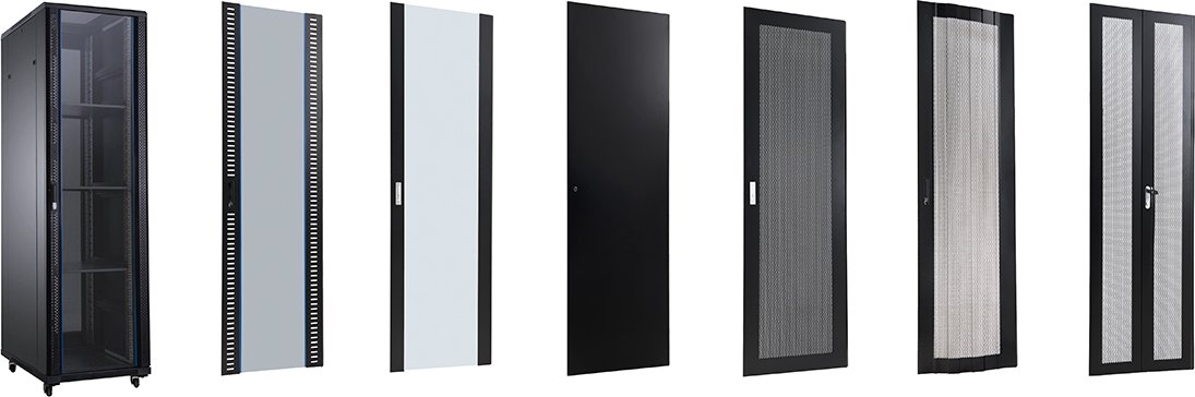 Distintas alturas y capacidades que van desde 22U a 47U, con anchos de entre 600 mm a 800 mm y fondos entre 600 mm a 1000 mm. Todos los armarios poseen puertas de cristal, perforadas o, en el caso de los armarios más grandes, existe la opción de doble puerta, lo que permite trabajar en una parte del mueble mientras la otra parte está cerrada y protegida.