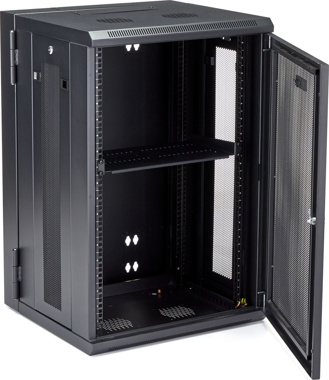 Este armario rack para sala de servidores de 18U con numerosas funciones es ideal para optimizar el almacenamiento de equipos en armarios de red centros de borde y tiendas de tecnología con espacio limitado, donde se necesitan equipos montables. Cuenta con carriles de montaje ajustables, puertas y paneles de malla, así como opciones de refrigeración activa.