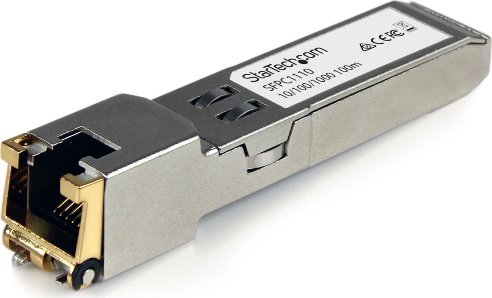 StarTech.com Módulo Transceptor SFP Compatible con el Modelo SFP-GE-T de Cisco - 1000BASE-T - SFP a RJ45 Cat6 / Cat5e - 10/100/1000 Mbps - RJ45 - 100m - Cisco IE3400, IE3300, IE3200. Tipo de transceptor SFP: Cobre, Rango máximo de transferencia de datos: 1250 Mbit/s, Tipo de interfaz: SFP. Color del producto: Plata, Tiempo medio entre fallos: 4655371 h. Consumo energético: 1,3 W. Certificados de conformidad: RoHS, Certificación: CE, FCC, UL, REACH. Ancho: 13 mm, Profundidad: 70 mm, Altura: 13 mm