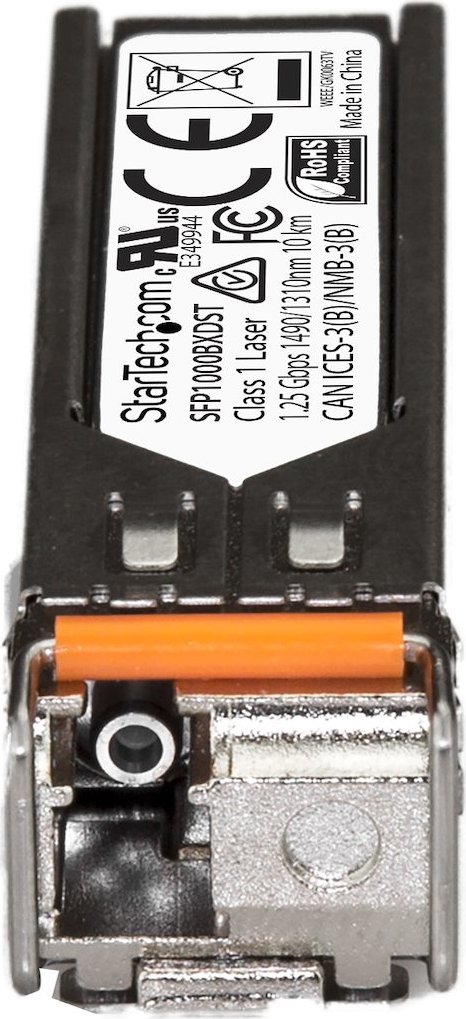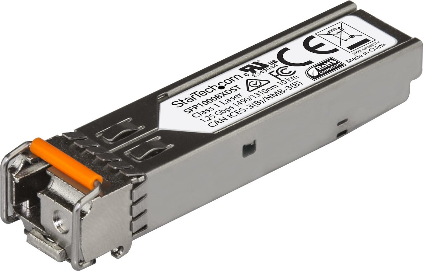 StarTech.com Módulo Transceptor SFP Compatible con MSA sin Codificar - 1000BASE-BX - Fibra BiDi Ethernet Gigabit Monomodo (SMF) de 1 GbE. Tipo de transceptor SFP: Fibra óptica, Rango máximo de transferencia de datos: 1250 Mbit/s, Tipo de interfaz: SFP. Color del producto: Plata, Material de la carcasa: Aluminio. Consumo energético: 1 W. Certificados de conformidad: RoHS, Certificación: CE, FCC, UR. Ancho: 14 mm, Profundidad: 57 mm, Altura: 13 mm