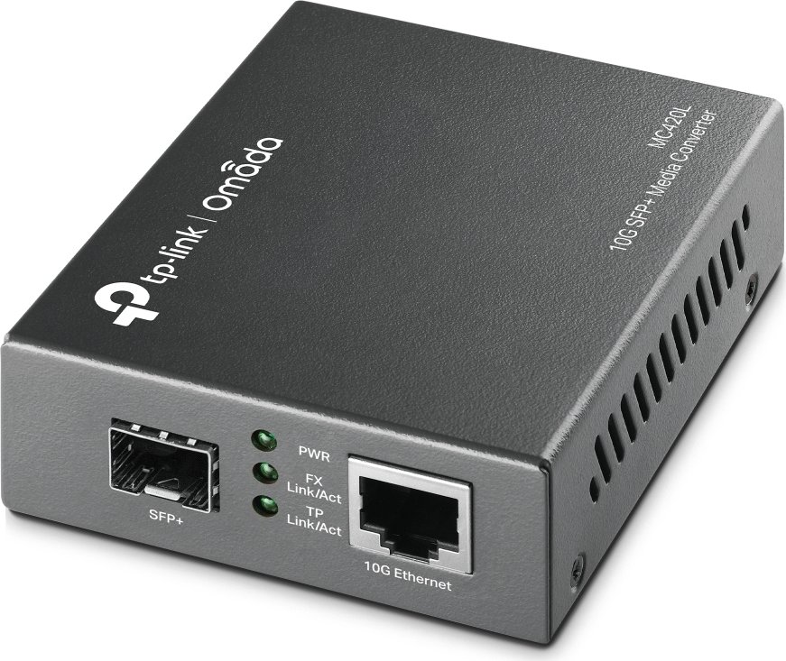 TP-Link MC420L. Rango máximo de transferencia de datos: 10000 Mbit/s, Estándares de red: IEEE 802.3ab, IEEE 802.3ae, IEEE 802.3an, IEEE 802.3aq, IEEE 802.3x, IEEE 802.3z, Tecnología de cableado ethernet de cobre: 2.5GBASE-T, 10GBASE-T, 1000BASE-T. Distancia de transferencia máxima: 100 m, Estructura de modo de fibra: Multimodo, Monomodo. Indicadores LED: Actividad, Enlace, Poder, Color del producto: Negro. Conector fibra óptica: SFP+, Tecnología de conectividad: Alámbrico. Consumo de energía (max): 4,12 W