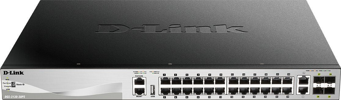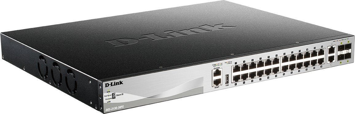 D-Link DGS-3130-30PS/E. Tipo de interruptor: Gestionado, Capa del interruptor: L3. Puertos tipo básico de conmutación RJ-45 Ethernet: Gigabit Ethernet (10/100/1000), Cantidad de puertos básicos de conmutación RJ-45 Ethernet: 24, Cantidad de puertos USB 2.0: 1. Tabla de direcciones MAC: 16384 entradas, Capacidad de conmutación: 168 Gbit/s. Estándares de red: IEEE 802.1D, IEEE 802.1Q, IEEE 802.1p, IEEE 802.1s, IEEE 802.1v, IEEE 802.1w, IEEE 802.1x, IEEE.... Conector eléctrico: Conector de alimentación AC-in. Energía sobre Ethernet (PoE). Montaje en rack