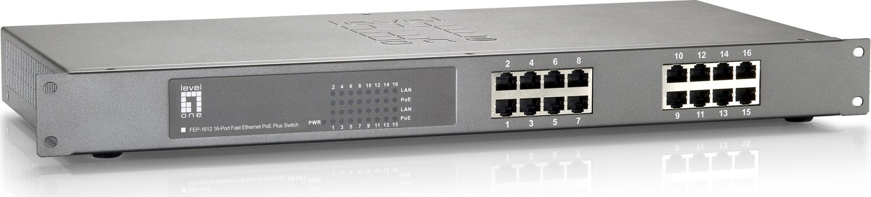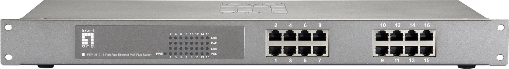 El LevelOne FEP-1612 ofrece 16 puertos Fast Ethernet a 10/100Mbps con interfaces PoE IEEE 802.3at/af. Soporta Auto MDI / MDI-X en los 16 puertos y ofrece la función de inyección PoE sobre todos los puertos, potenciando remotamente aquellos dispositivos compatibles con las normas IEEE 802.3af o 802.3at.