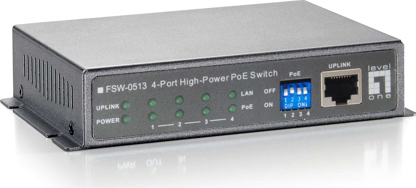 Con 4 interruptores DIP, cada puerto PoE puede Encenderse/Apagarse manualmente. La fuente de alimentación interna PoE pueden enviar hasta 48 Watts por un solo puerto. FSW-0513 es de tamaño compacto, lo que es ideal para usuarios de escritorio con espacio limitado. Usted también tiene la opción de instalar varios FSW-0513-Z en un chasis de 19 "(POC-6000) para una solución PoE que requiera un montaje en rack de gran escala.