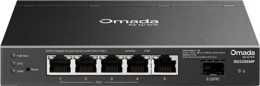 TP-Link SG2206MP. Capa del interruptor: L2. Puertos tipo básico de conmutación RJ-45 Ethernet: Gigabit Ethernet (10/100/1000), Cantidad de puertos básicos de conmutación RJ-45 Ethernet: 5, Número de módulos SFP instalados: 1. Tabla de direcciones MAC: 8000 entradas, Capacidad de conmutación: 12 Gbit/s. Voltaje de entrada DC: 53.5 V. Energía sobre Ethernet (PoE). Montaje en rack