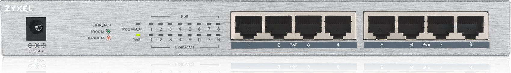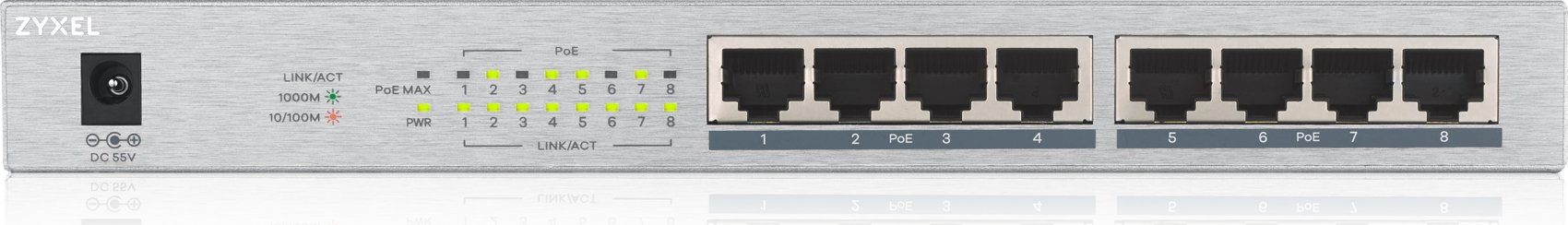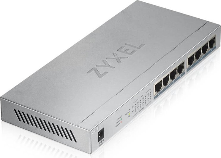Zyxel GS1008HP. Tipo de interruptor: No administrado. Puertos tipo básico de conmutación RJ-45 Ethernet: Gigabit Ethernet (10/100/1000), Cantidad de puertos básicos de conmutación RJ-45 Ethernet: 8. Capacidad de conmutación: 16 Gbit/s. Estándares de red: IEEE 802.3, IEEE 802.3ab, IEEE 802.3u, IEEE 802.3x. Voltaje de entrada DC: 55 V. Conector eléctrico: Toma de entrada de CC. Energía sobre Ethernet (PoE)