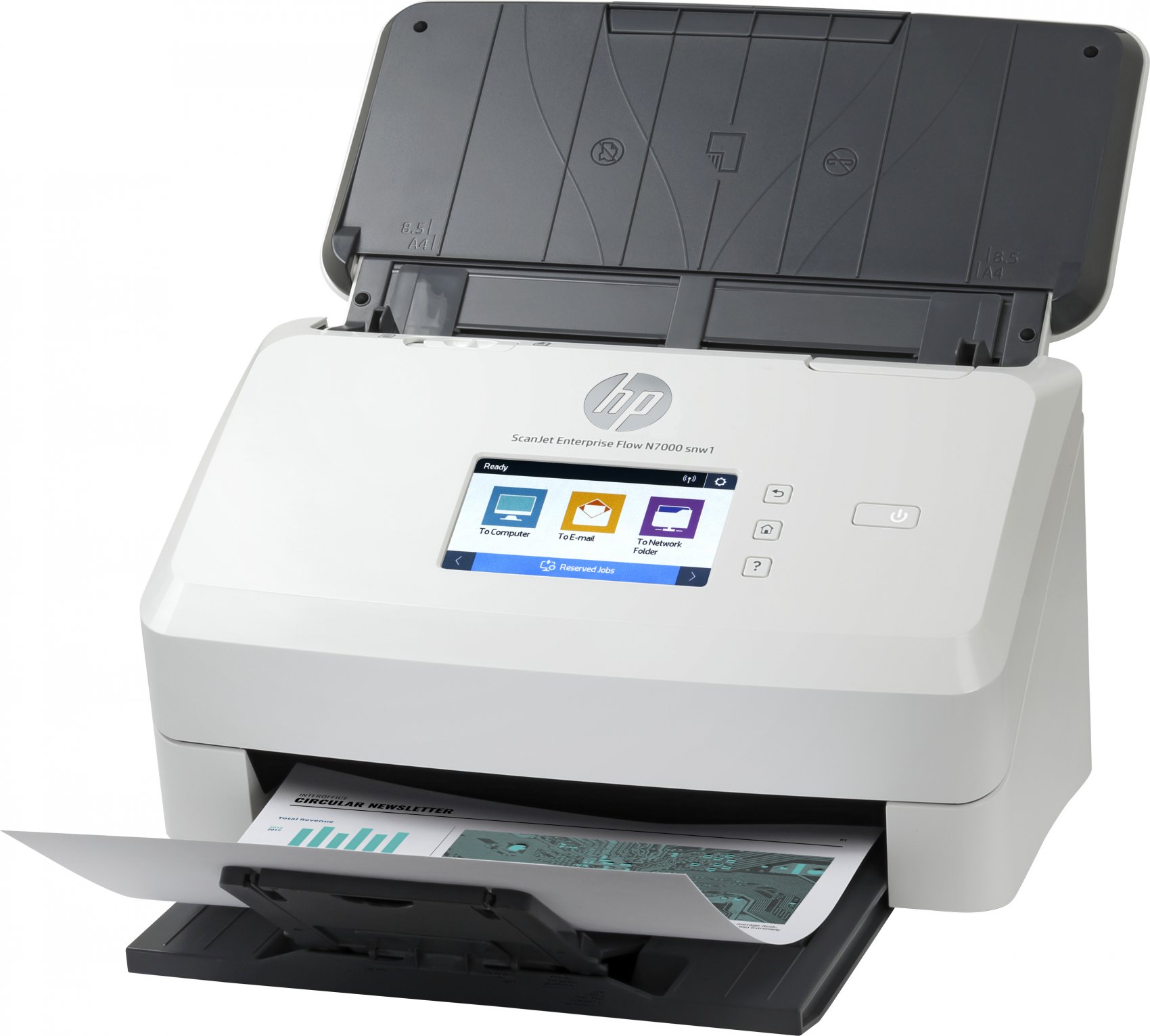 HP Scanjet Enterprise Flow N7000. Tamaño máximo de escaneado: 216 x 3098 mm, Resolución óptica de escáner: 600 x 600 DPI, Profundidad de entrada de color: 48 bit. Tipo de escaneado: Escáner alimentado con hojas, Color del producto: Blanco, Diagonal de la pantalla: 7,11 cm (2.8"). Tipo de sensor: CMOS CIS, Ciclo de trabajo diario (max): 7500 páginas, Fuentes de luz: LED. Capacidad del alimentador automático de documentos: 80 hojas. Tamaño máximo de papel ISO A-series: A4, Tipos de media soportados de escaneo: Tarjeta de visita, Peso del papel en Alimentador de Documentos Automático: 43 - 350 g/m²