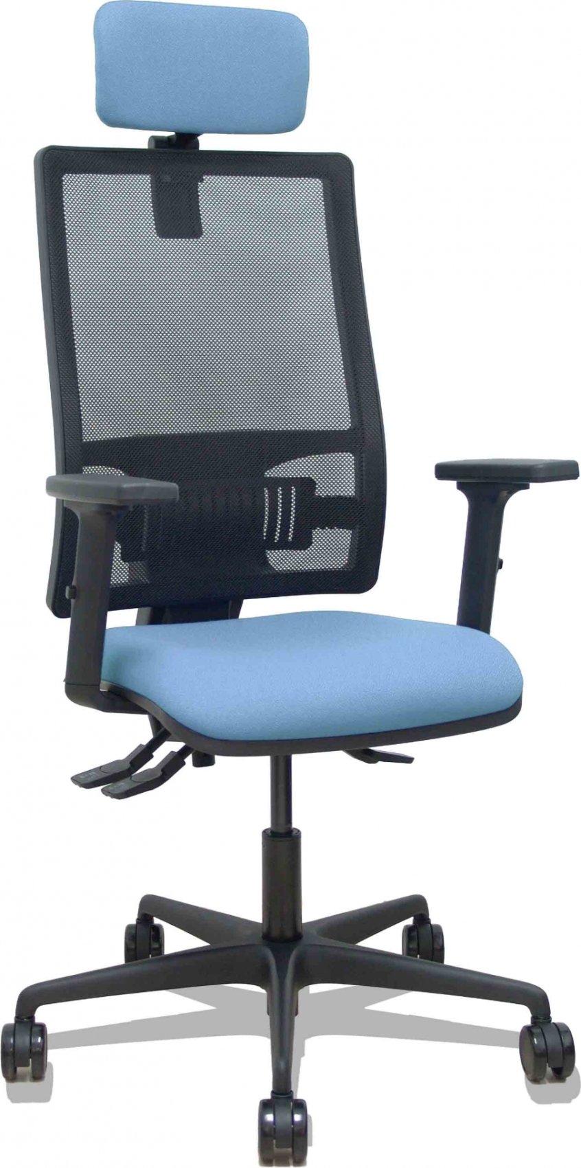 Piqueras y Crespo Silla Bormate asincro malla negra asiento bali azul cielo brazos 2D ruedas 65mm cabecero regulable