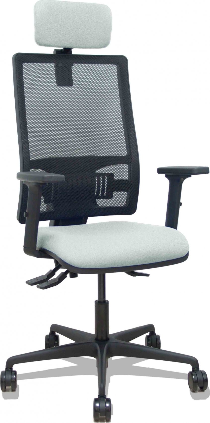 Piqueras y Crespo Silla Bormate asincro malla negra asiento bali gris claro brazos 2D ruedas 65mm cabecero regulable
