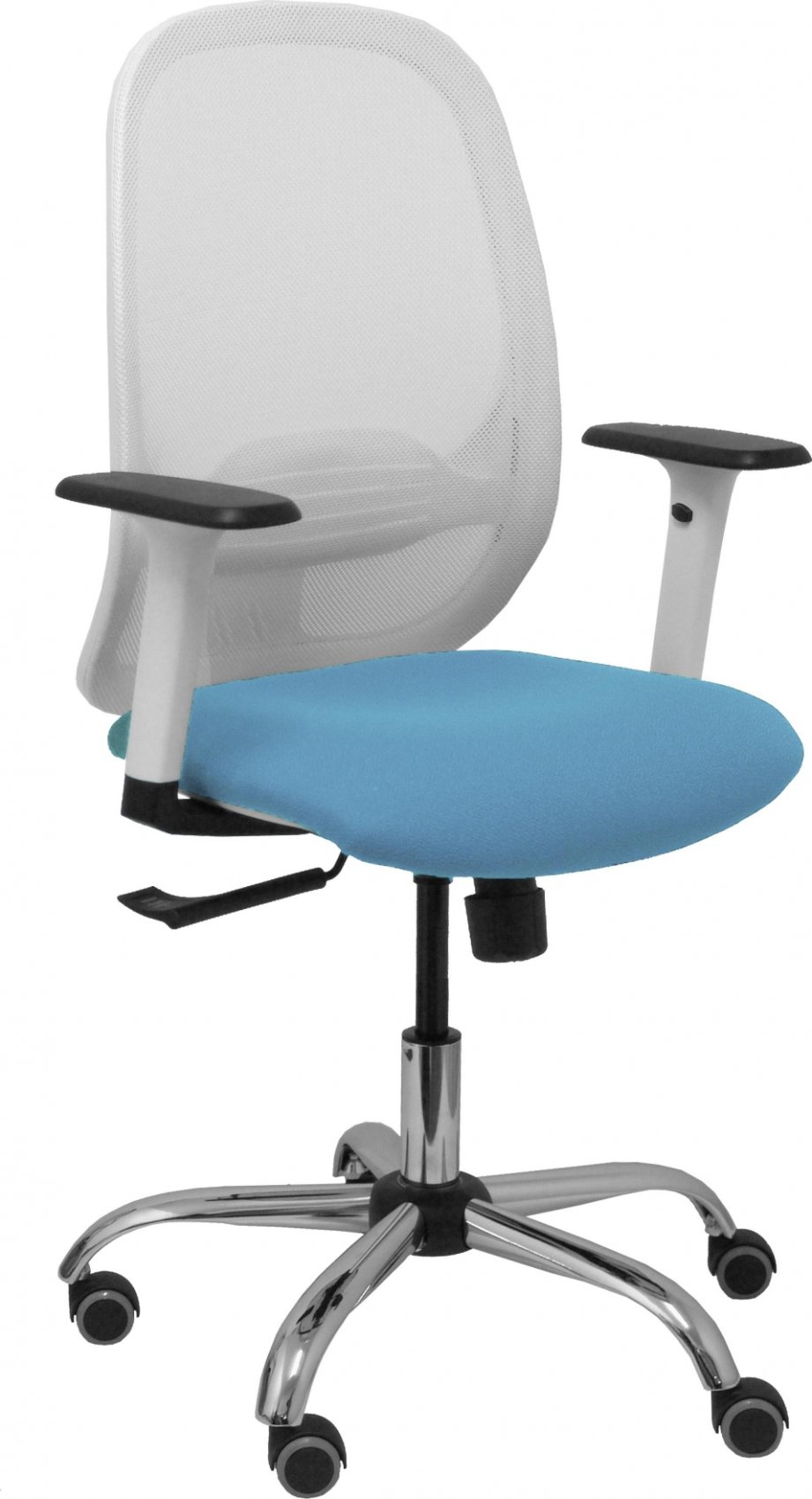 Piqueras y Crespo Silla Cilanco blanca malla blanca asiento bali azul cielo brazo regulable base cromada ruedas de parq ué