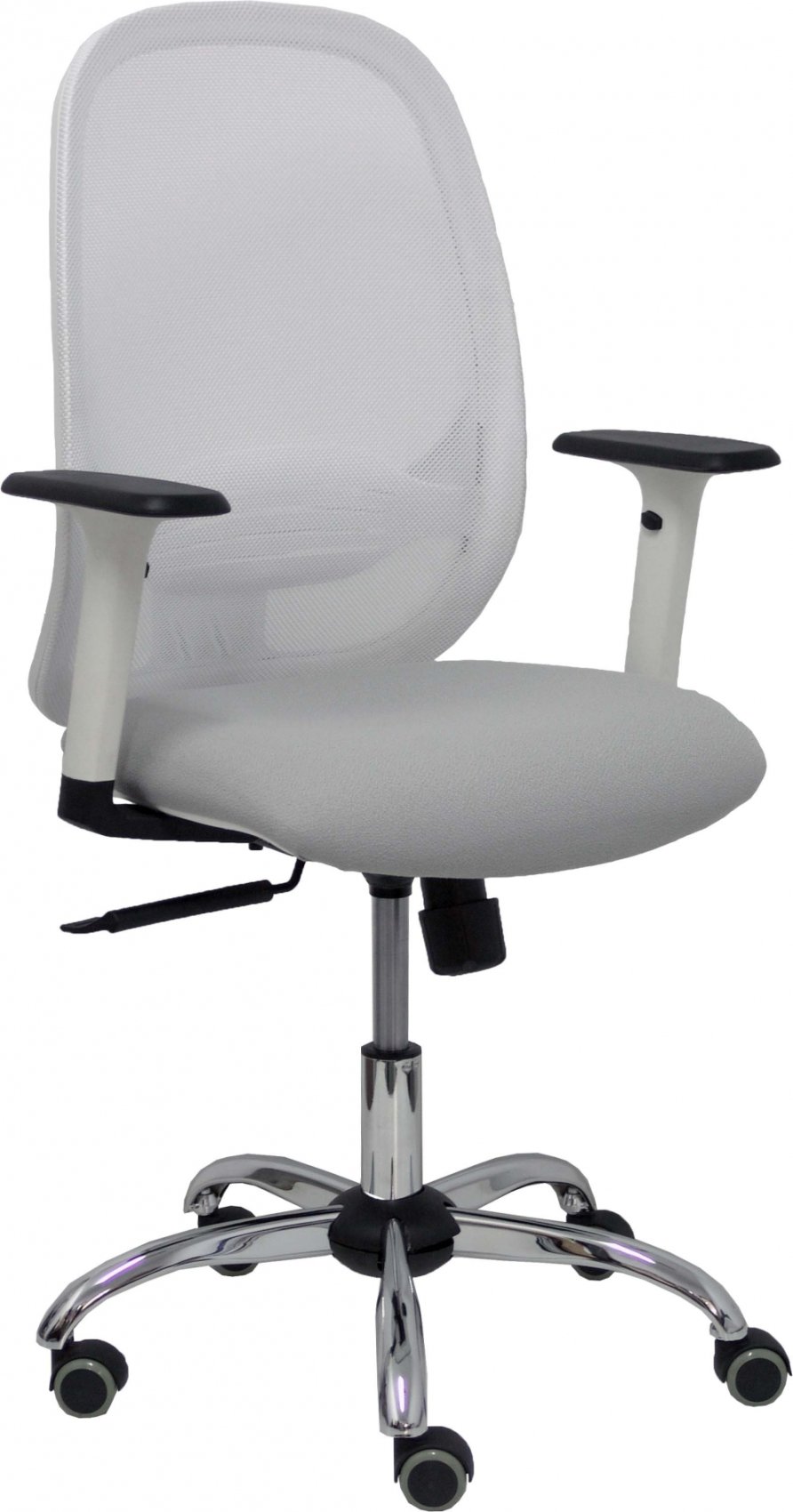 Piqueras y Crespo Silla Cilanco blanca malla blanca asiento bali gris claro brazo regulable base cromada ruedas parqué