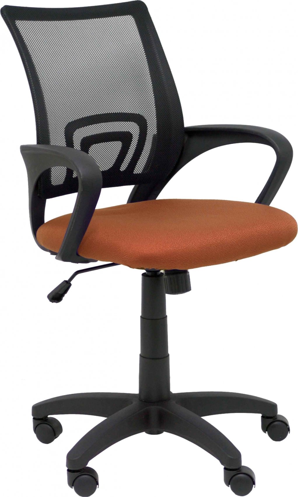 Respaldo de malla color negro y asiento tapizado en tejido bali color marrón.