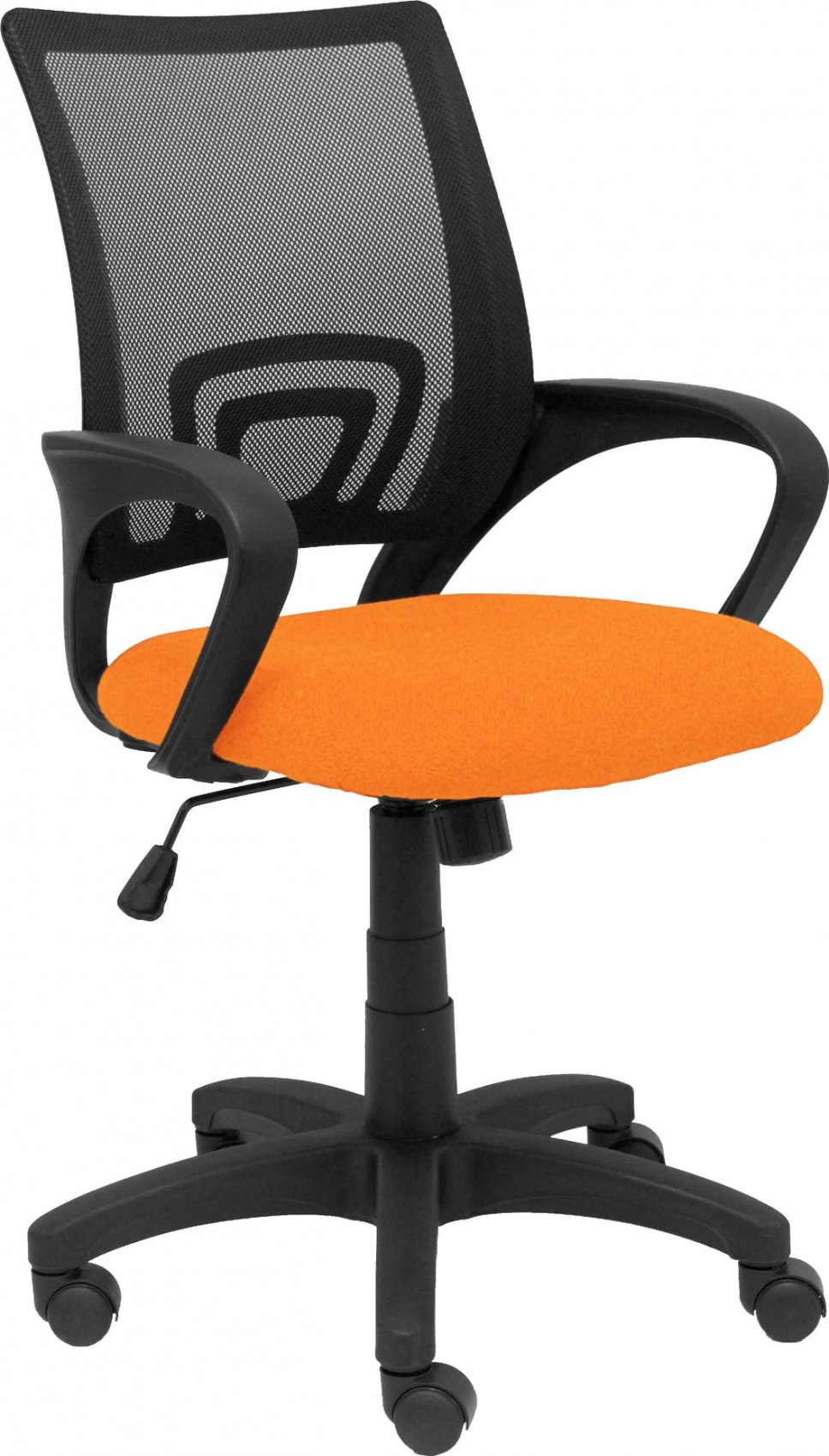 Respaldo de malla color negro y asiento tapizado en tejido bali color naranja.