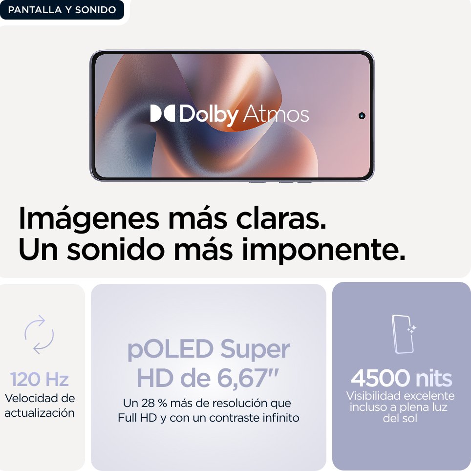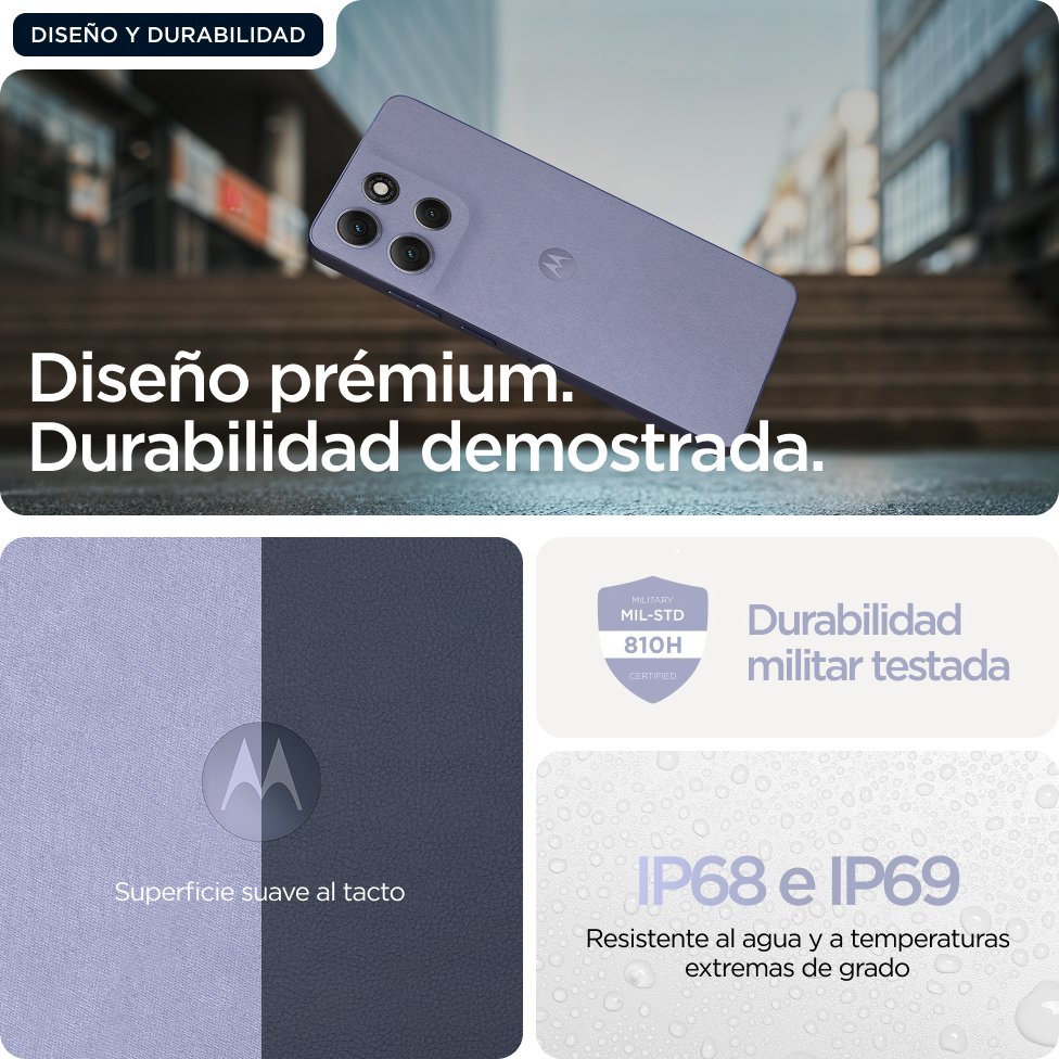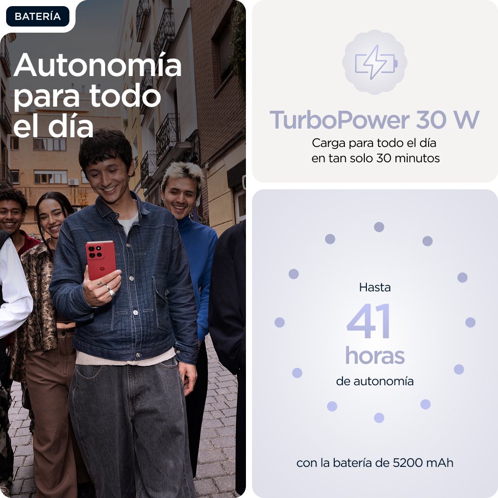 Motorola moto g86 5G . Diagonal de la pantalla: 16,9 cm (6.67"), Resolución de la pantalla: 2712 x 1220 Pixeles. Familia de procesador: MediaTek Dimensity, Modelo del procesador: 7300. Capacidad de RAM: 8 GB, Capacidad de almacenamiento interno: 256 GB. Resolución de la cámara trasera (numérica): 50 MP, Tipo de cámara trasera: Cámara doble. Capacidad de la tarjeta SIM: SIM doble. Sistema operativo instalado: Android 15. Capacidad de batería: 5200 mAh. Color del producto: Lila. Peso: 185 g