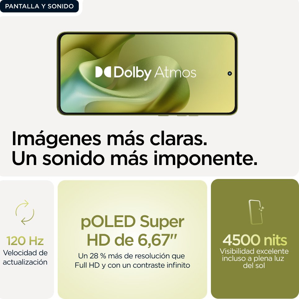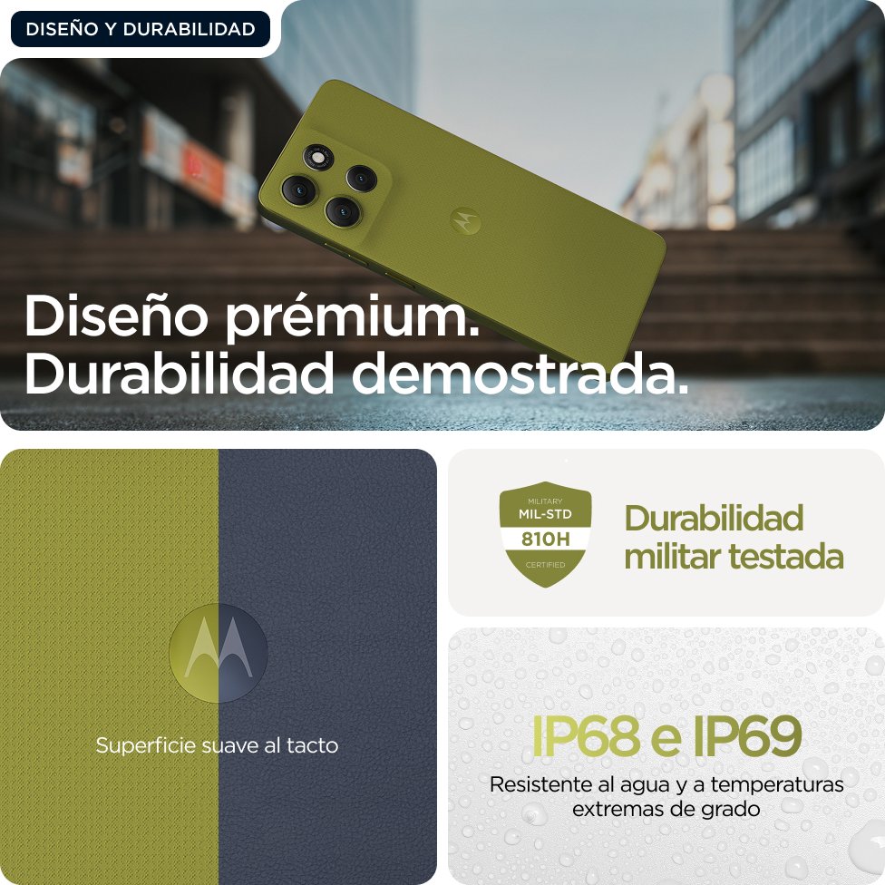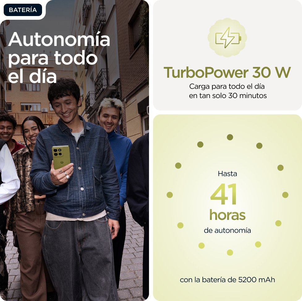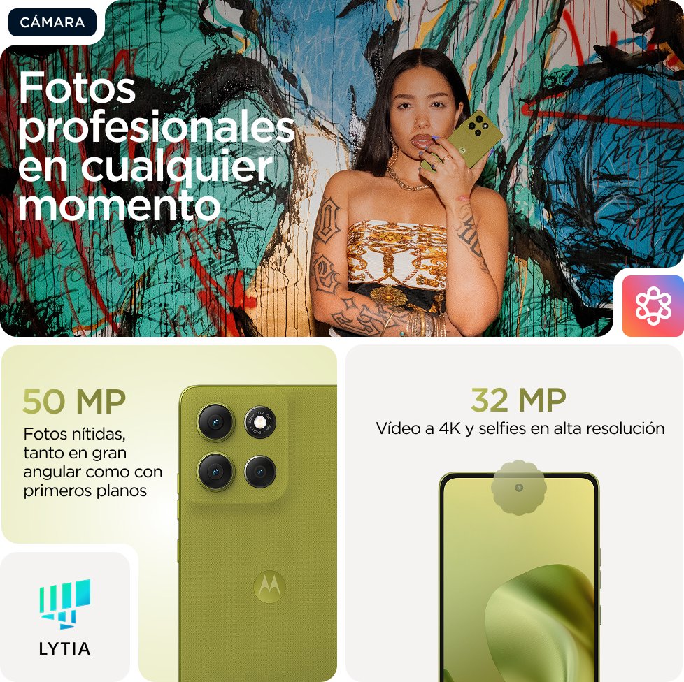 Motorola moto g86 5G . Diagonal de la pantalla: 16,9 cm (6.67"), Resolución de la pantalla: 2712 x 1220 Pixeles. Familia de procesador: MediaTek Dimensity, Modelo del procesador: 7300. Capacidad de RAM: 8 GB, Capacidad de almacenamiento interno: 256 GB. Resolución de la cámara trasera (numérica): 50 MP, Tipo de cámara trasera: Cámara doble. Capacidad de la tarjeta SIM: SIM doble. Sistema operativo instalado: Android 15. Capacidad de batería: 5200 mAh. Color del producto: Verde. Peso: 185 g