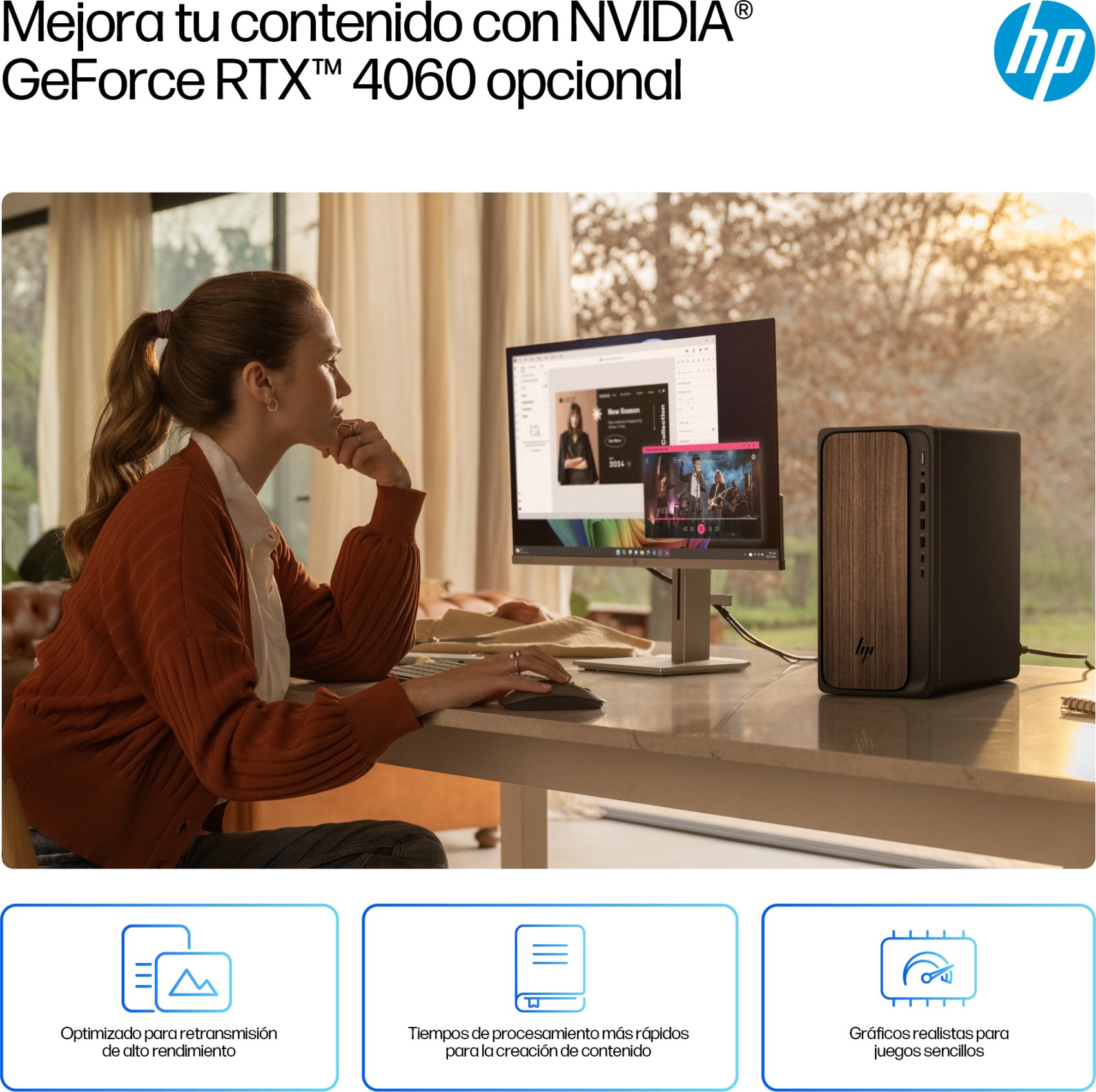 El ordenador de sobremesa con IA HP OmniDesk, equipado con el procesador Intel Core™ Ultra[1] y tecnología de IA integrada, ofrece una eficacia y un rendimiento óptimos para tus tareas diarias más exigentes, lo que te garantiza una multitarea fluida y capacidades mejoradas de IA.- Premium PC Madera, Negro 280 W