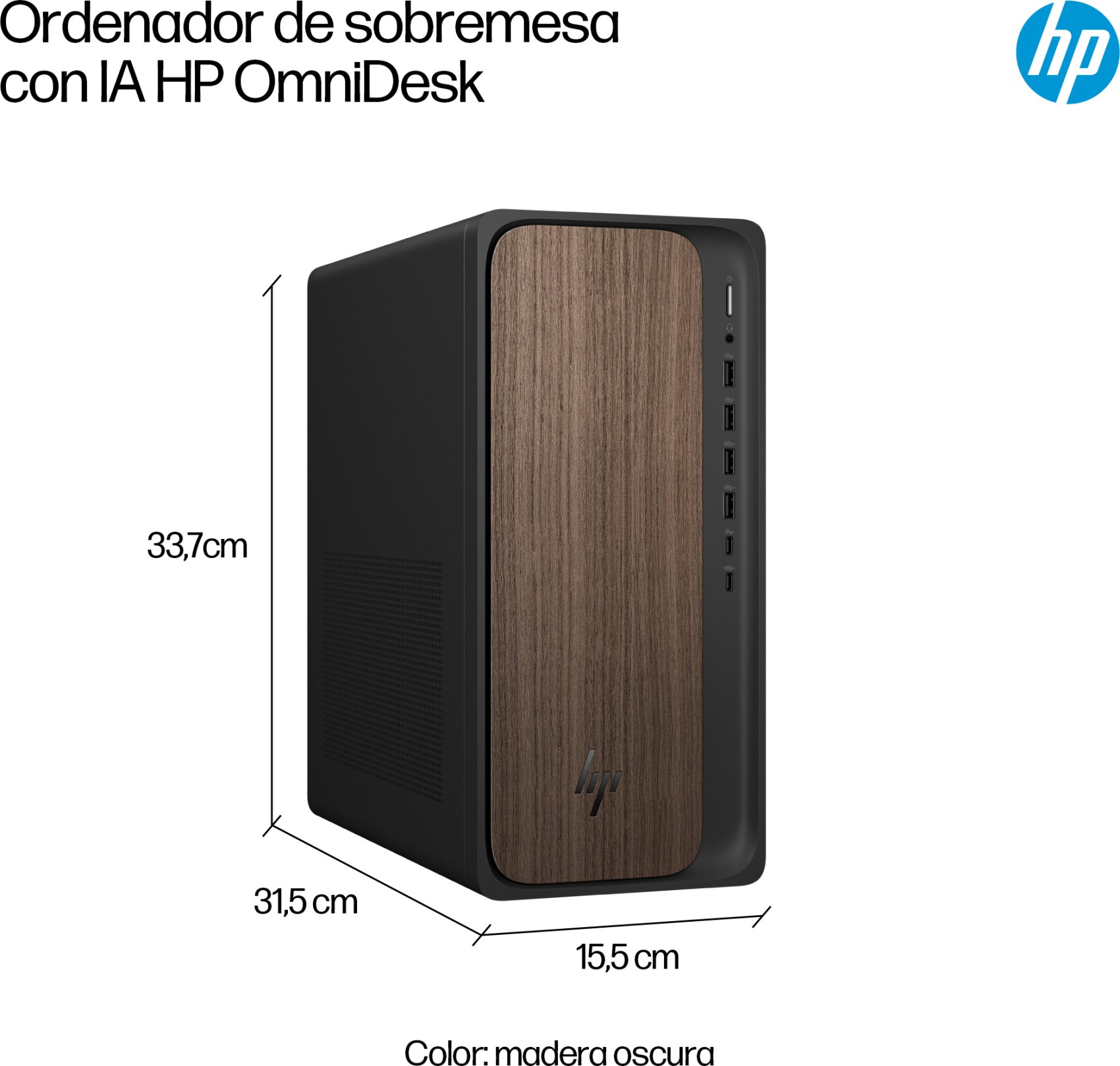 HP OmniDesk Desktop AI M03-0019ns PC. Familia de procesador: Intel Core Ultra 5, Modelo del procesador: 225. Memoria interna: 16 GB, Tipo de memoria interna: DDR5-SDRAM, Velocidad de memoria del reloj: 5600 MHz. Capacidad total de almacenaje: 1 TB, Unidad de almacenamiento: SSD. Modelo de adaptador gráfico incorporado: Intel Graphics. Wifi. Sistema operativo instalado: Windows 11 Home. Fuente de alimentación: 280 W. Tipo de chasis: Torre. Tipo de producto: PC. Peso: 5,34 kg. Color del producto: Madera, Negro