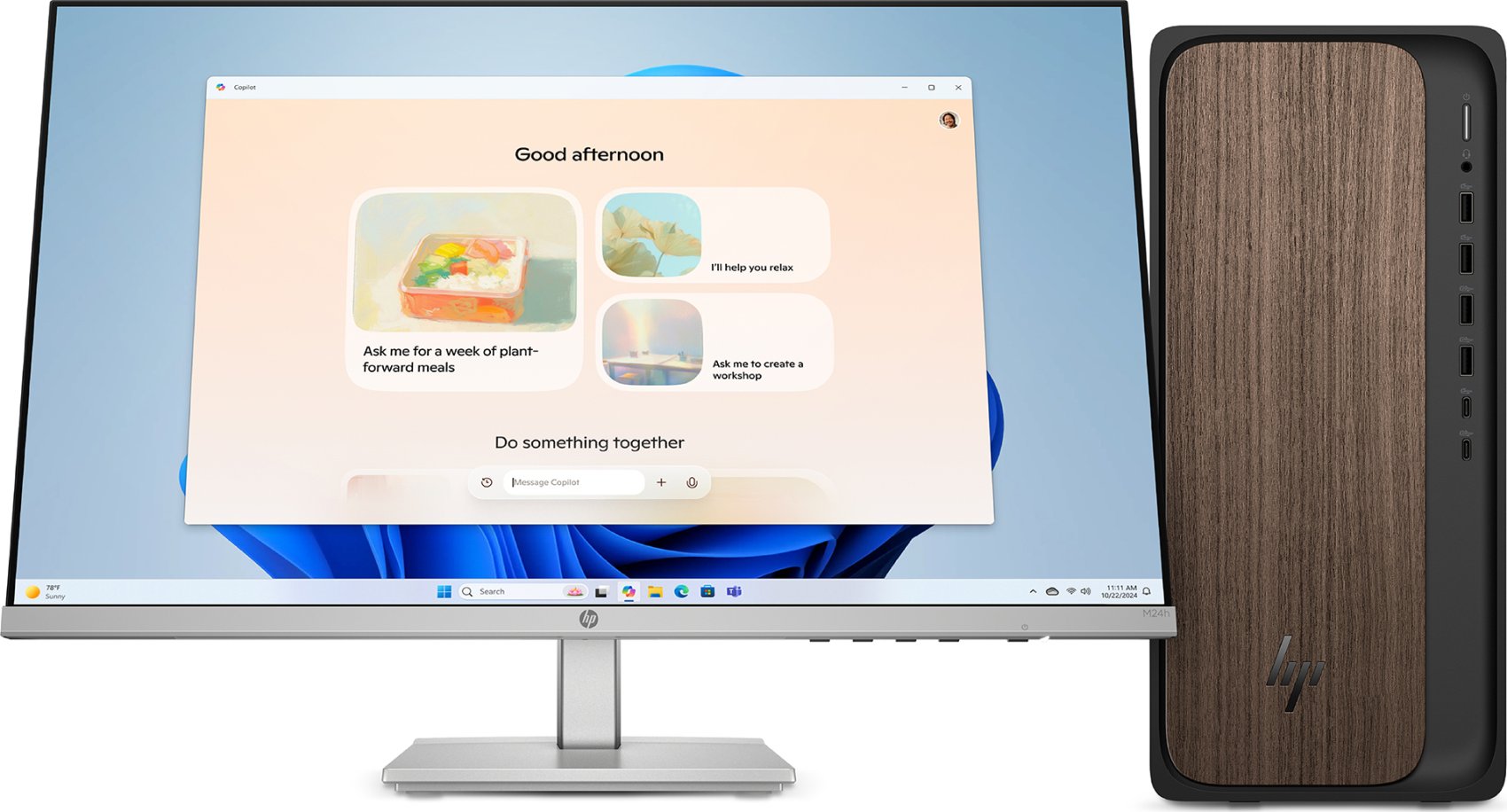 Un ordenador de sobremesa con IA con un moderno acabado inspirado en madera que se integra perfectamente en cualquier espacio.