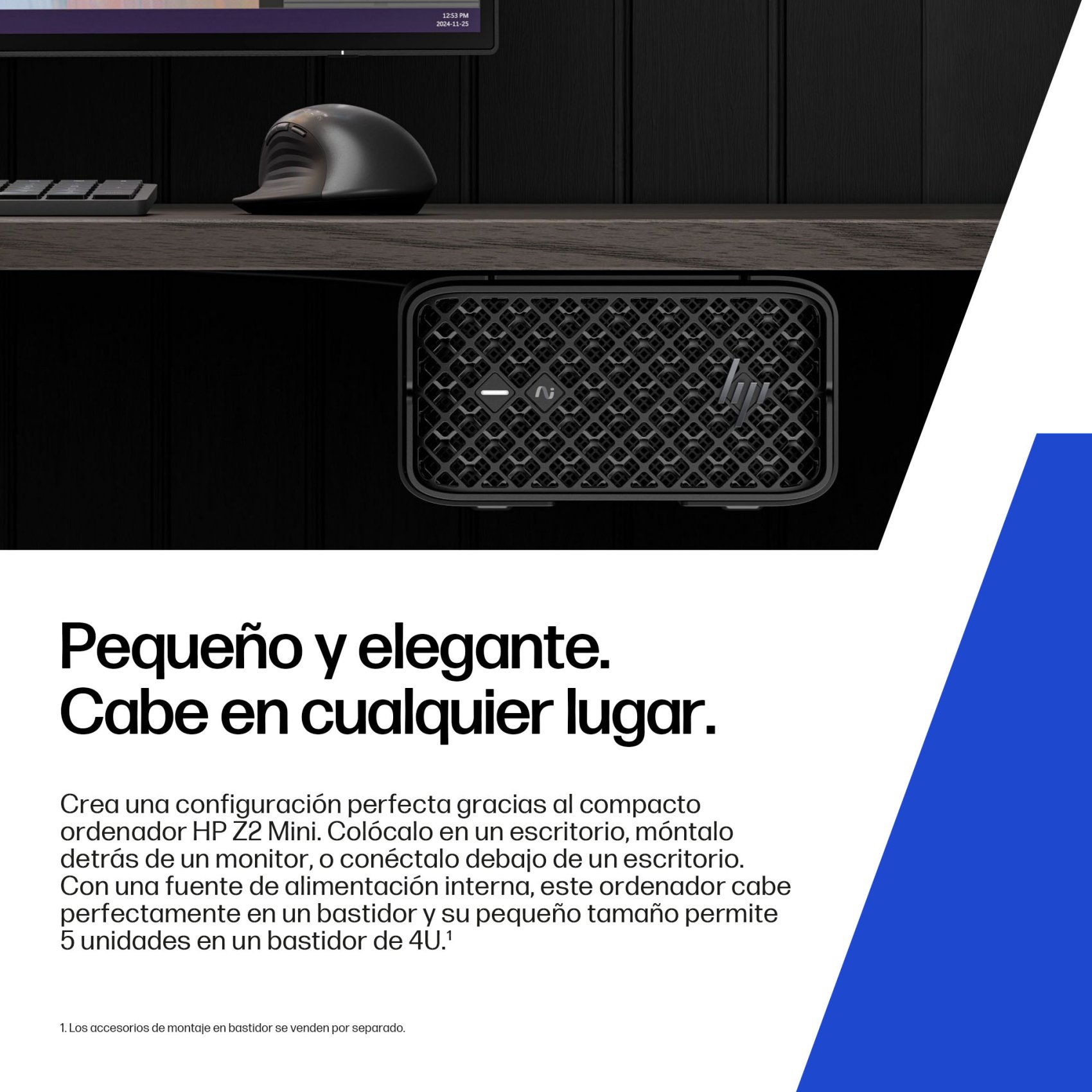 Crea una configuración perfecta con el compacto Z2 Mini. Colócalo en un escritorio, móntalo detrás de un monitor o conéctalo debajo de un escritorio. Con una fuente de alimentación interna, este ordenador cabe perfectamente en un bastidor, y su pequeño tamaño permite 5 unidades en un bastidor de 4U.[3]