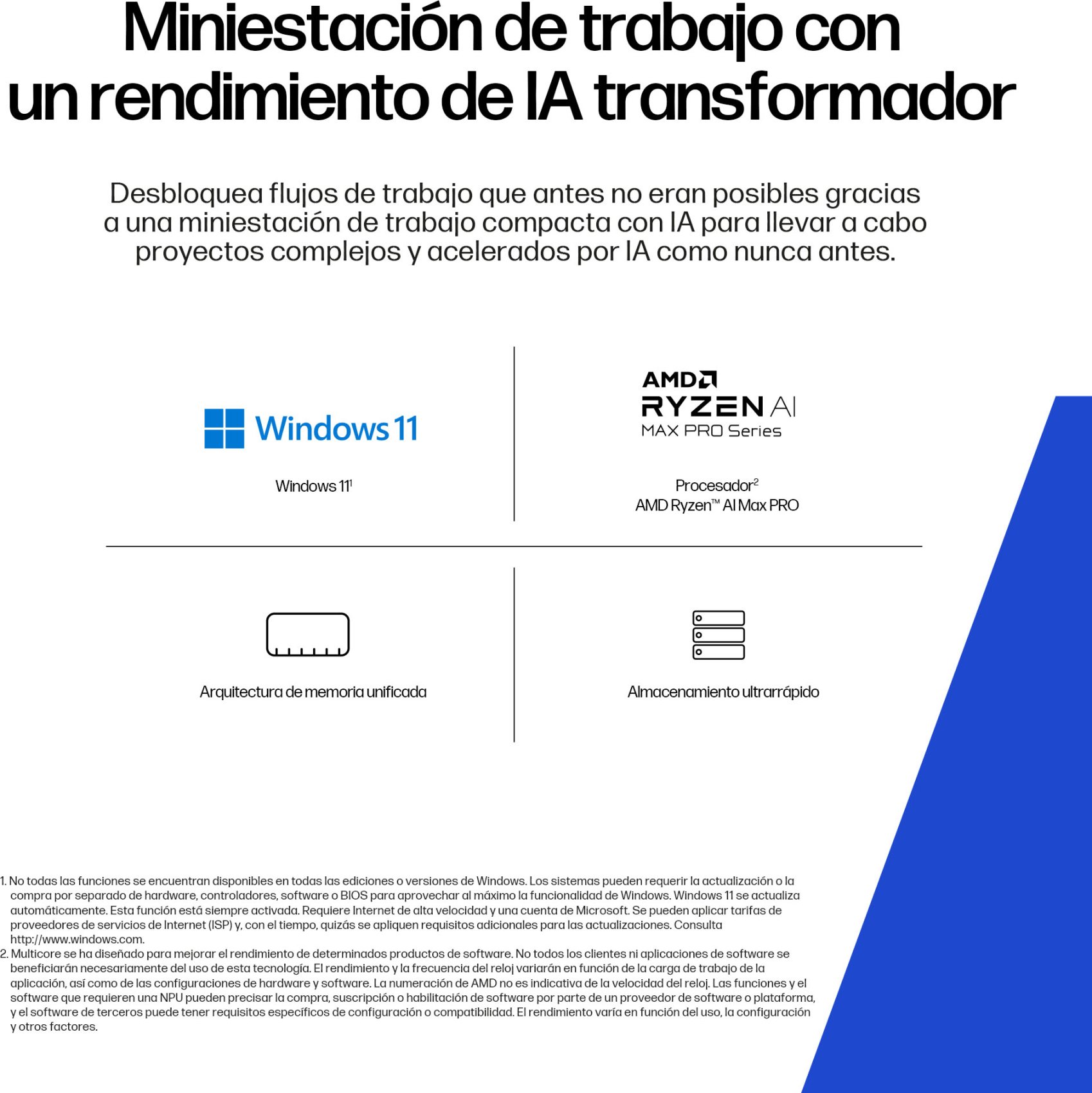 Afronta flujos de trabajo nuevos y masivos de forma local en una miniestación de trabajo con un procesador AMD Ryzen™ con IA Max PRO[1], con núcleos de CPU de sobremesa, gráficos integrados de tipo discreto, memoria unificada y la capacidad para asignar memoria a la GPU,[2] y gestiona de forma local proyectos con un uso intensivo de gráficos.