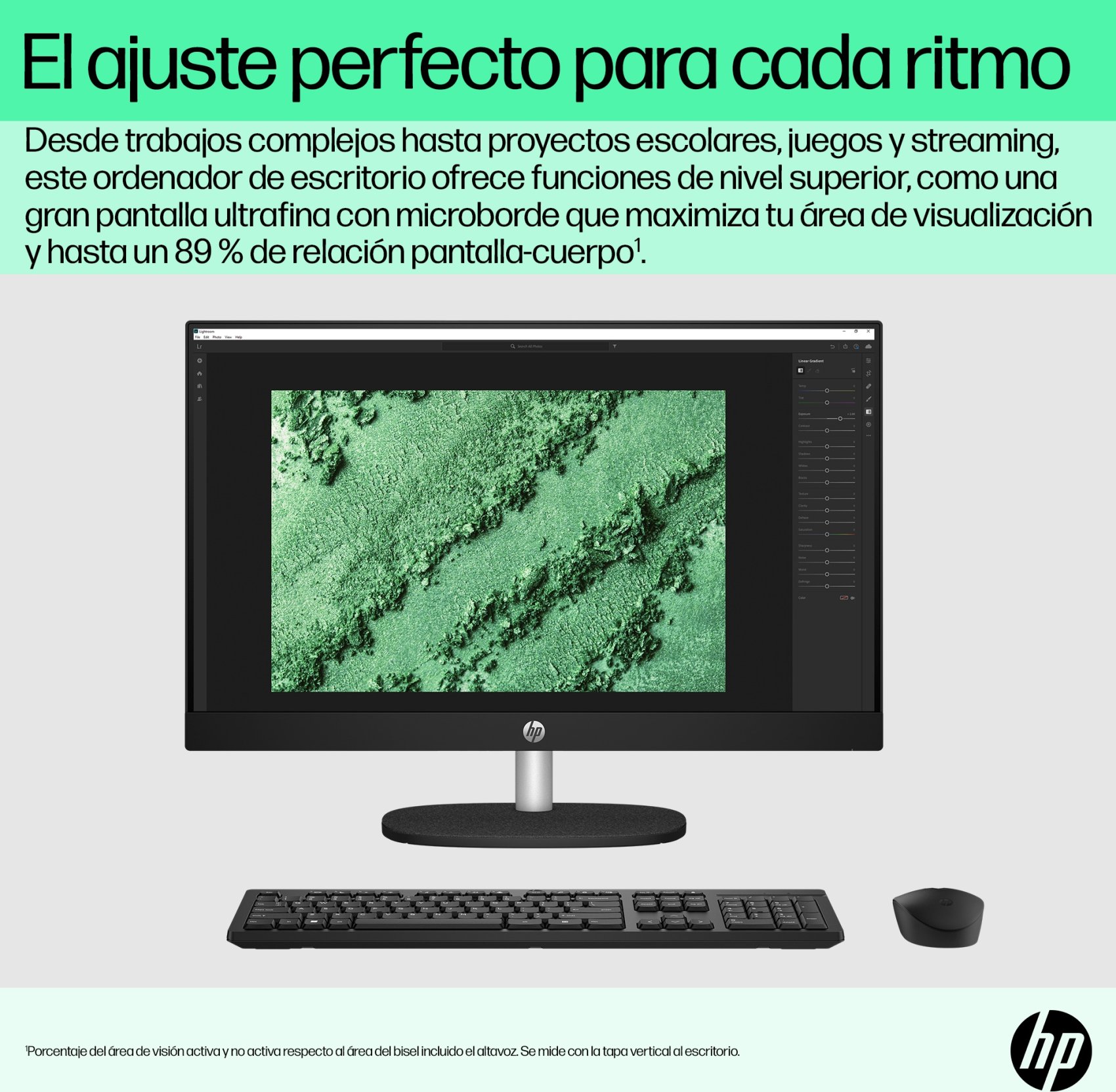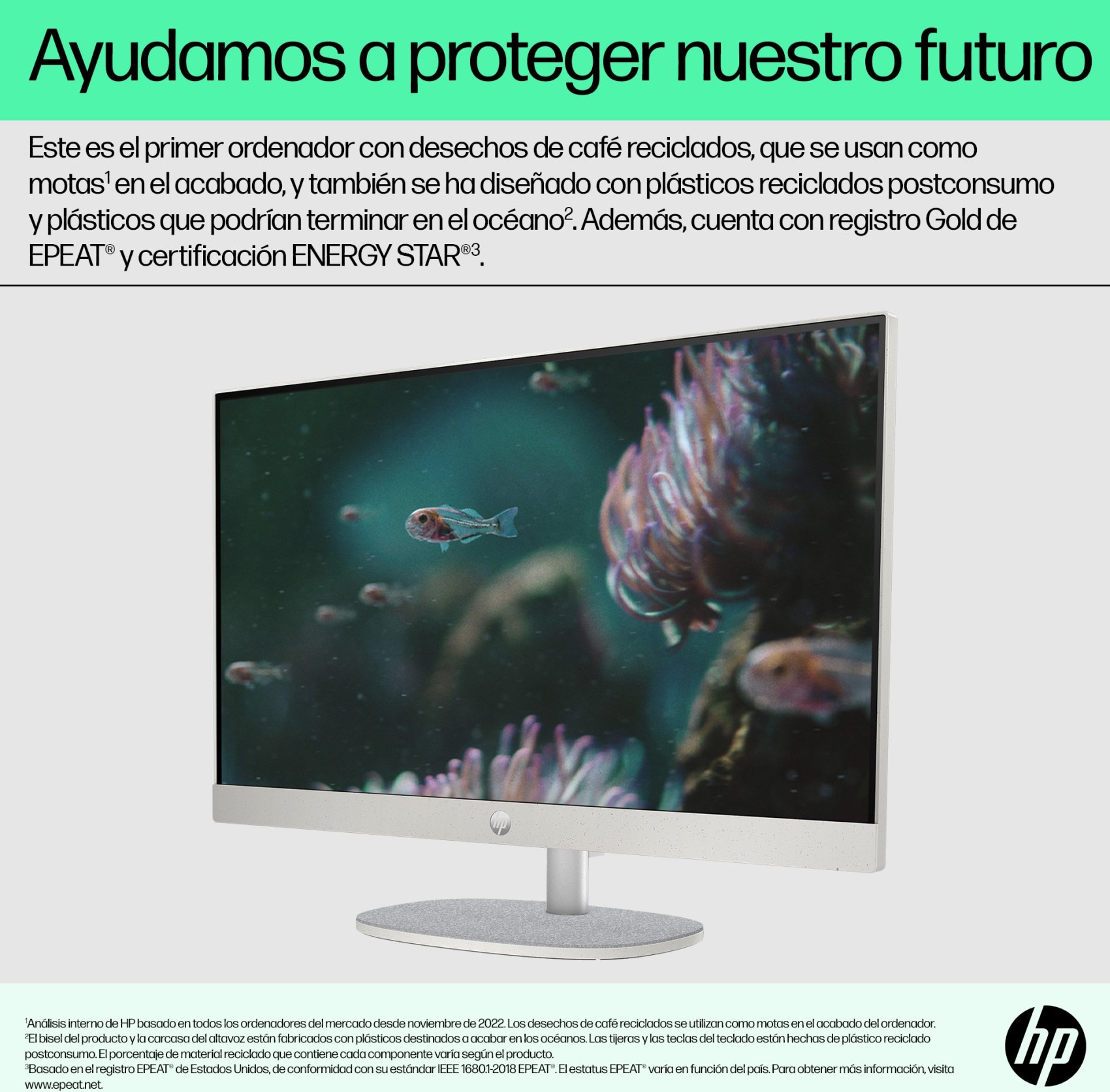 El compacto PC de sobremesa All-in-One HP de 23,8" te permite hacer más con menos. Fabricado de manera sostenible con plásticos destinados a acabar en los océanos y plásticos reciclados posconsumo[1]. Además, cuenta con certificación EPEAT® Gold y ENERGY STAR®[2]. Gracias a su potente procesador, la memoria ampliada y las funciones multitarea mejoradas, no tendrás que renunciar a un gran rendimiento.