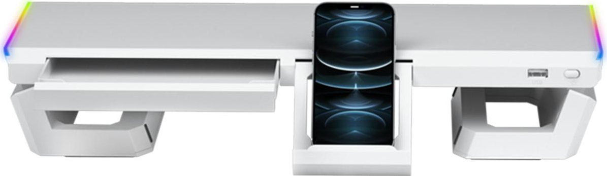 Soporte premium para monitor con iluminación avanzada CHROMA RGB, puerto USB 2.0, soporte para móviles/tablets y cajón para almacenaje. Totalmente ajustable con 3 tamaños diferentes gracias a sus laterales plegables.