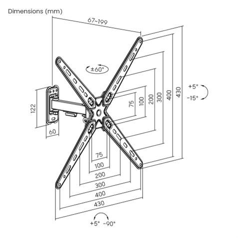 • VESA: 75x75, 100x100, 100x200, 200x100, 200x200, 300x200, 400x200, 300x300, 400x300, 400x400