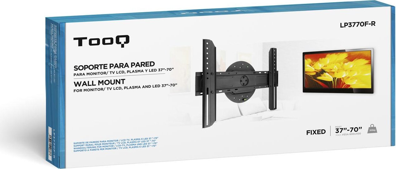 TooQ Soporte de pared rotación 360° (monitor / plasma / LCD / LED) 37" - 70". Capacidad máxima de peso: 50 kg, Tamaño mínimo de pantalla: 94 cm (37"), Tamaño máximo de pantalla: 177,8 cm (70"), Compatibilidad con interfaz de montaje (min): 200 x 200 mm, Compatibilidad con interfaz de montaje (max): 600 x 400 mm. Ángulo de rotación: 360°, Distancia a la pared (max): 5,1 cm. Color del producto: Negro