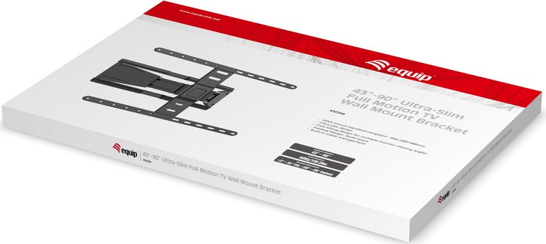 Equip Soporte de pared para televisor ultrafino de movimiento completo de 43"-90. Capacidad máxima de peso: 50 kg, Tamaño mínimo de pantalla: 109,2 cm (43"), Tamaño máximo de pantalla: 2,29 m (90"), Compatibilidad con interfaz de montaje (min): 100 x 200 mm, Compatibilidad con interfaz de montaje (max): 600 x 400 mm. Ángulo de inclinación: -15 - 3°, Ángulo de giro (alcance): -30 - 30°, Distancia a la pared (min): 1,95 cm, Distancia a la pared (max): 25 cm. Color del producto: Negro