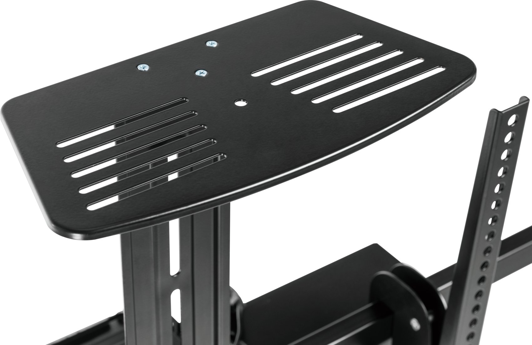 Su robusta construcción garantiza la estabilidad, mientras que su elegante diseño complementa cualquier espacio. Con ruedas bloqueables, ofrece una fácil movilidad y un posicionamiento seguro. El sistema integrado de gestión de cables mantiene los cables organizados, y el carro incluye un estante para equipos audiovisuales, por lo que es una solución completa para presentaciones y señalización digital."