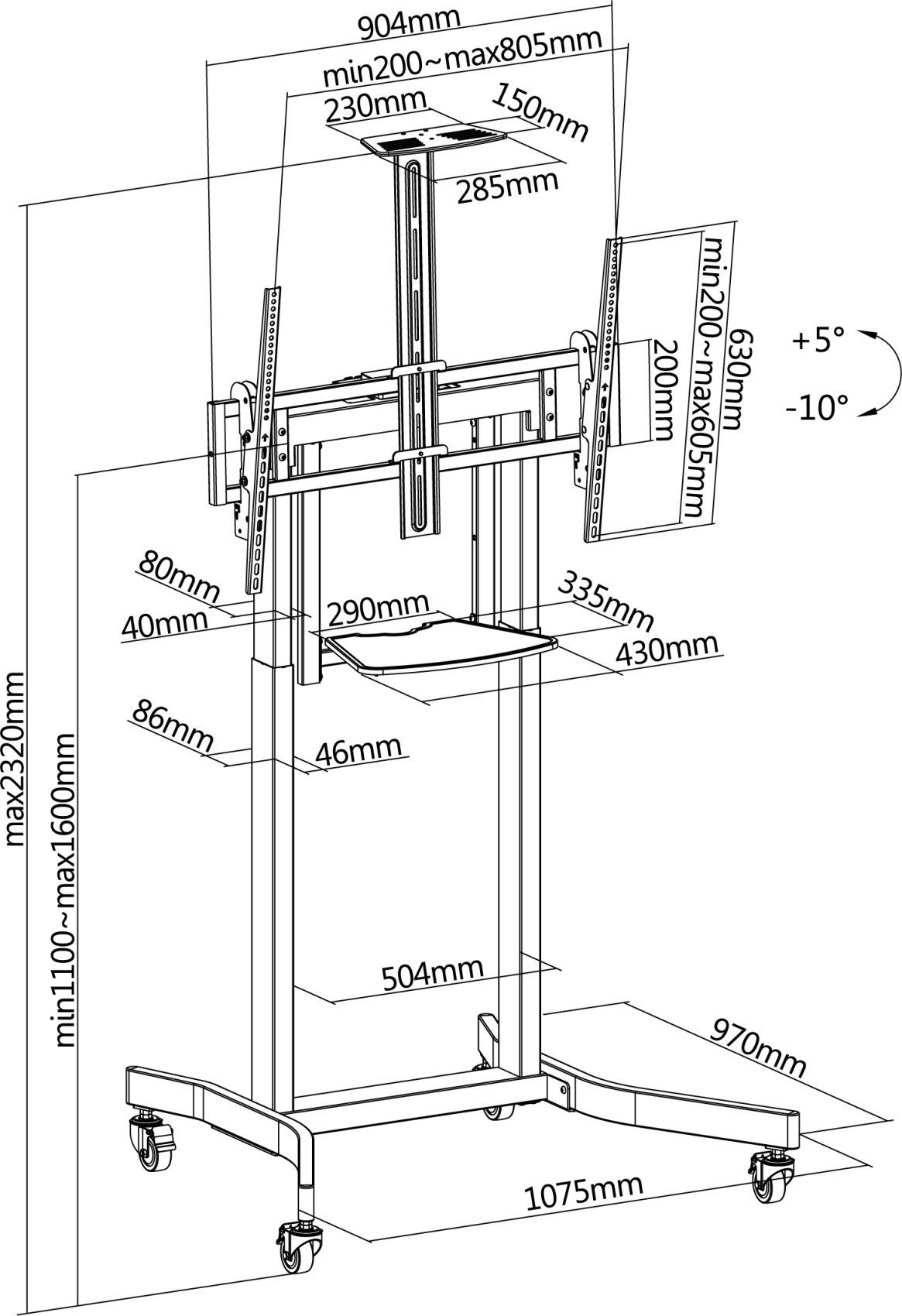 Equip Carro motorizado móvil LFD de 55"-100. Capacidad máxima de peso: 120 kg, Tamaño mínimo de pantalla: 139,7 cm (55"), Tamaño máximo de pantalla: 2,54 m (100"), Compatibilidad con interfaz de montaje (min): 200 x 200 mm, Compatibilidad con interfaz de montaje (max): 800 x 600 mm. Ángulo de inclinación: -10 - 5°. Color del producto: Negro