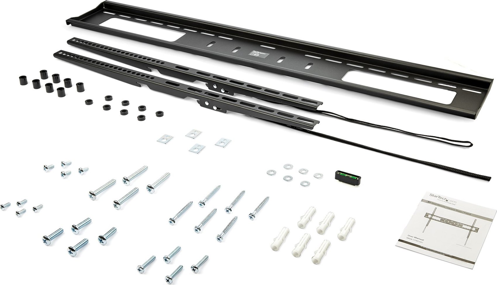 Ahorre espacio y cree una impresionante configuración de pantalla gracias al montaje en pared de un televisor grande en una sala de juntas o espacio de atención al cliente. Con un atractivo diseño de perfil bajo, este soporte de montaje en pared para televisor de pantalla plana permite instalar de forma fija modelos de TV de hasta 100". Cree una pantalla o muro digital interactivo Instale su TV de pantalla plana grande donde sus visitantes, clientes y empleados puedan visualizarlo mejor. Cree una configuración de pantalla interactiva para mantener a sus visitantes informados o entretenidos. Solución ideal para vestíbulos, auditorios, restaurantes, centros de atención sanitaria y otros espacios de reunión. Compatible con la mayoría de las pantallas planas LED o LCD de TV de 60" a 100" de tamaño y peso de hasta 75kg. Se adapta a televisores curvos, con un soporte VESA compatible de hasta 900x600. Diseño de perfil bajo Ahorre espacio gracias a este delgado soporte de montaje en pared para TV. Gracias a su diseño de perfil bajo, el televisor queda a 30,5mm de la pared Duradera fabricación en acero y fácil instalación Este soporte de servicio pesado tiene capacidad para el montaje seguro de su TV de pantalla plana grande y se instala fácilmente. El resorte se bloquea para permitir el rápido enganche y desenganche. Su diseño abierto permite la ventilación y fácil acceso a los cables. Producto avalado por la garantía de 2 años de StarTech.com y con soporte técnico gratuito de por vida.